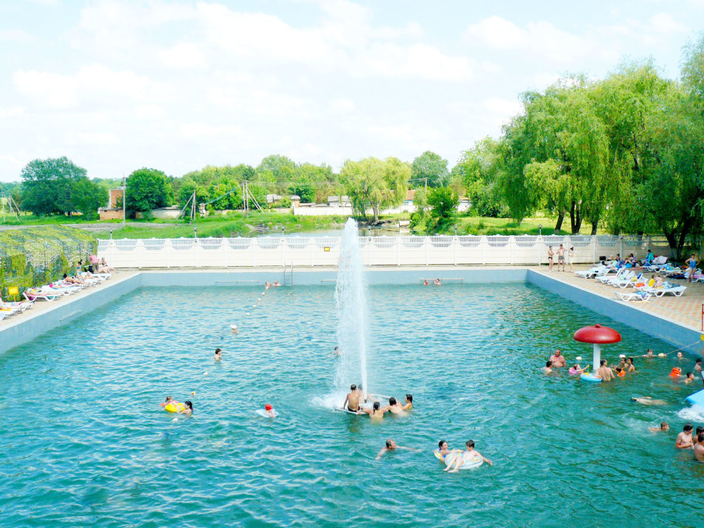 Второй бассейн на этой территории – наполняется артезианской водой. Размер 50м*23м, глубина 120 см. В бассейне выложены гидромассажные ванны, работают гейзеры, водяная пушка, кобра. Оснащен комплексом водных горок: винтовая (для детей от 8 лет), двойной спуск (от 8 лет),(высота 6 м. ) камикадзе (с 14 лет до 120 кг.) дополнительная детская водная горка для детей 6-8 лет (высота 2м.) Капитальное здание - раздевалки, душевые, туалетные.