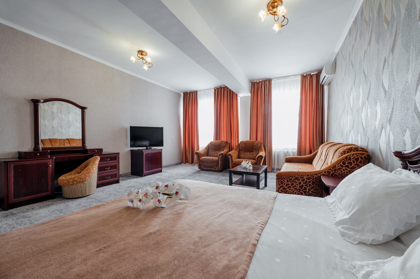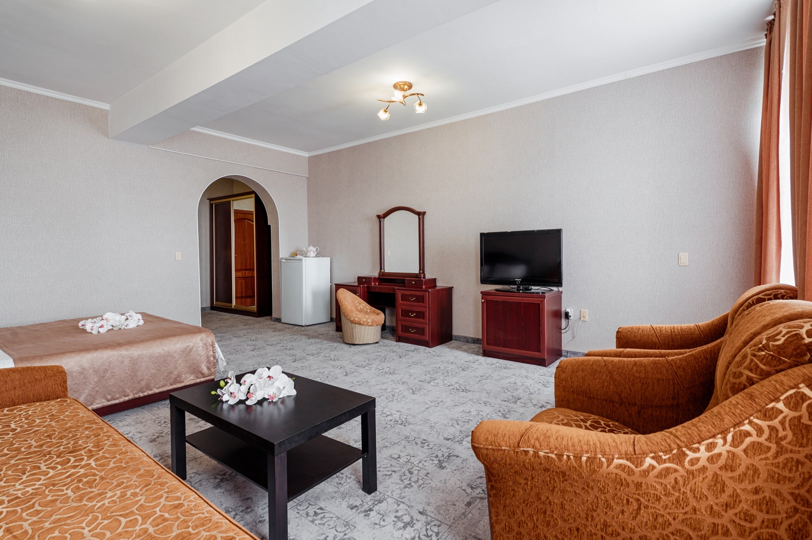 вешалка, диван, зеркало, кресло-кровать, кровать двуспальная, прикроватные тумбочки, стол, стул, шкаф-купе