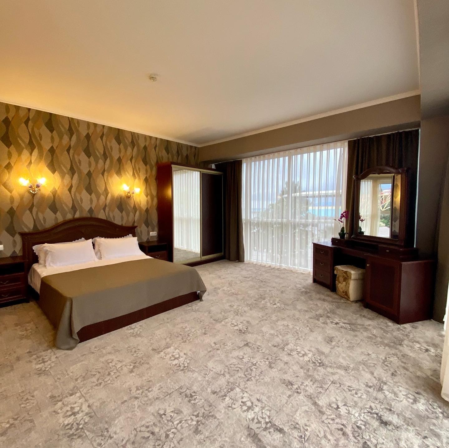 вешалка, диван, зеркало, кровать двуспальная, прикроватные тумбочки, столик туалетный, стул, шкаф-купе