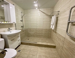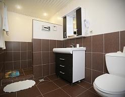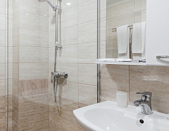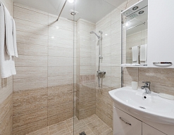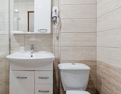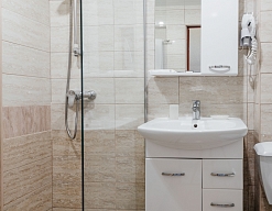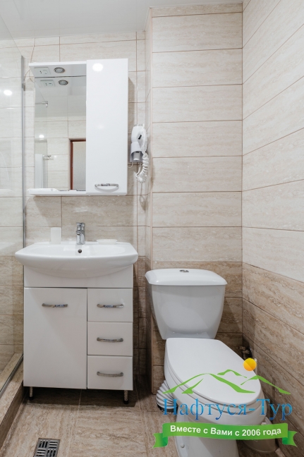с душевой кабиной, туалетные принадлежности, фен