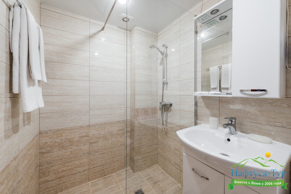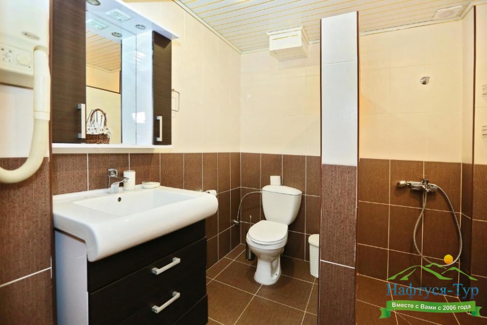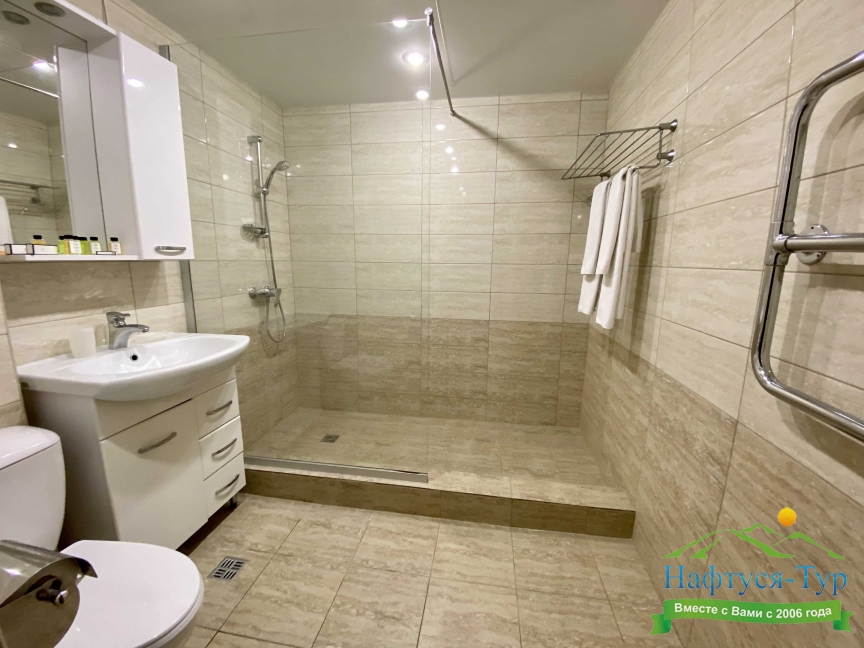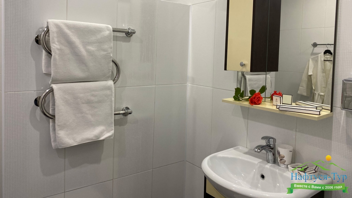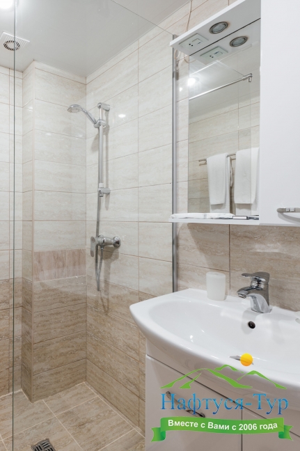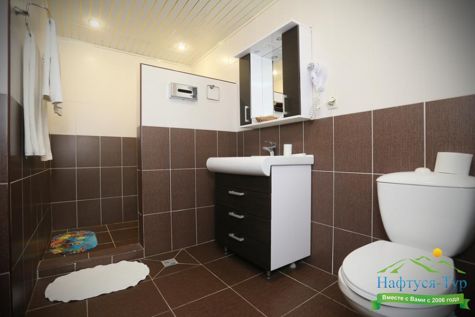 с душем, тапочки, туалетные принадлежности, фен, халат