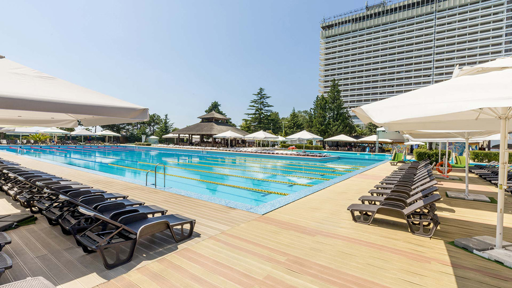 Сочинский ГРАНД-ОТЕЛЬ «ЖЕМЧУЖИНА» – это прямое воплощение всех представлений о комфортабельном и восхитительном отдыхе у моря в самом центре главного российского курортного города! Корпуса и территория гостиницы находятся в центральной части Сочи, в первой береговой линии. Номера для гостей в «Жемчужине» расположены в 19-ти этажном корпусе. Благодаря этому открывающиеся из окон панорамы Кавказских гор и Черного моря особенно великолепны. Окружает отель уникальная парковая зона с тропическими растениями, в 100 метрах – частный пляж, длина 200 м, это единственный частный пляж среди отелей Краснодарского края. А ещё здесь к вашим услугам два открытых бассейна с морской водой – детский и плавательный.