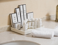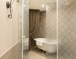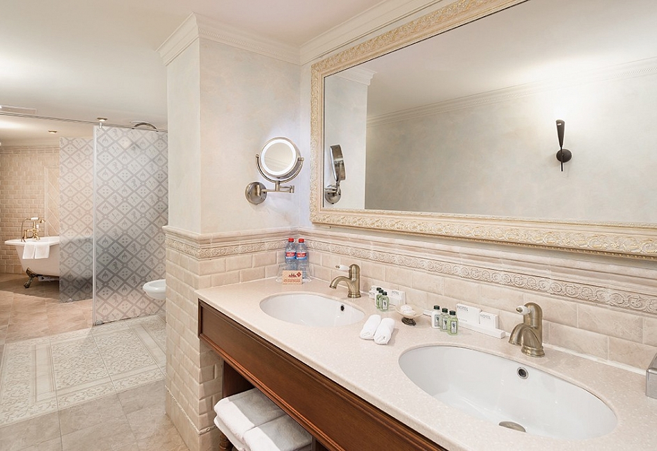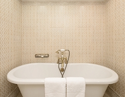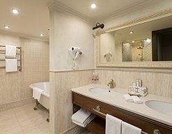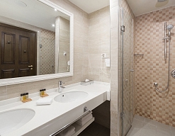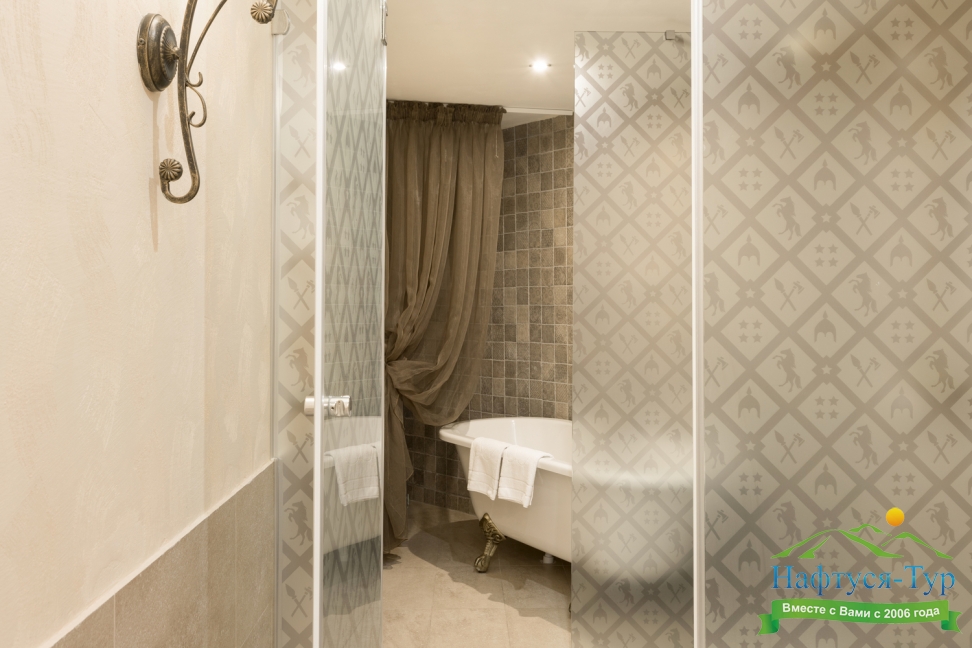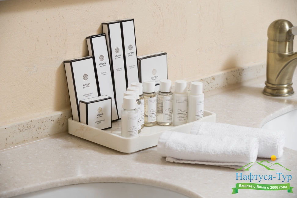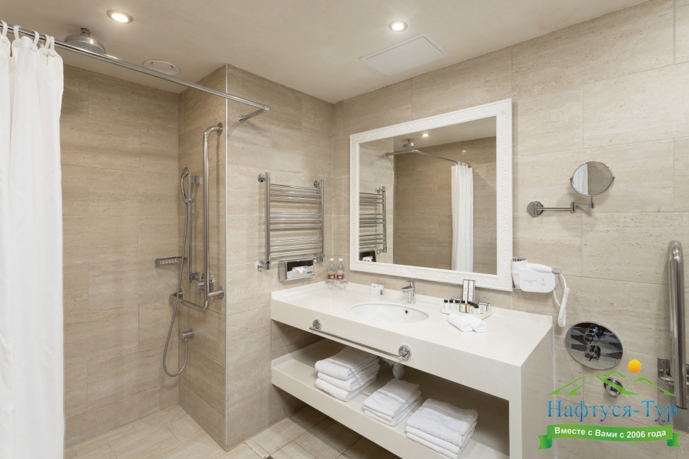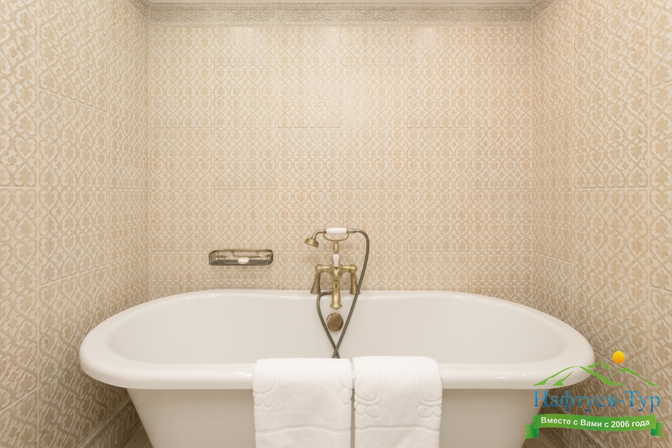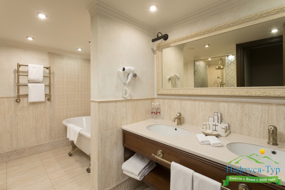 биде, с ванной и душевой кабиной, тапочки, туалетные принадлежности, фен, халат