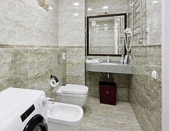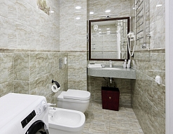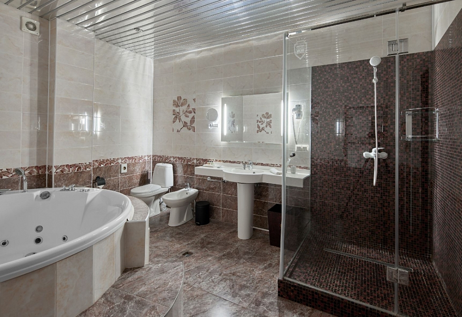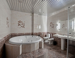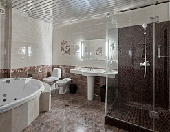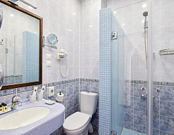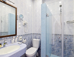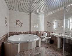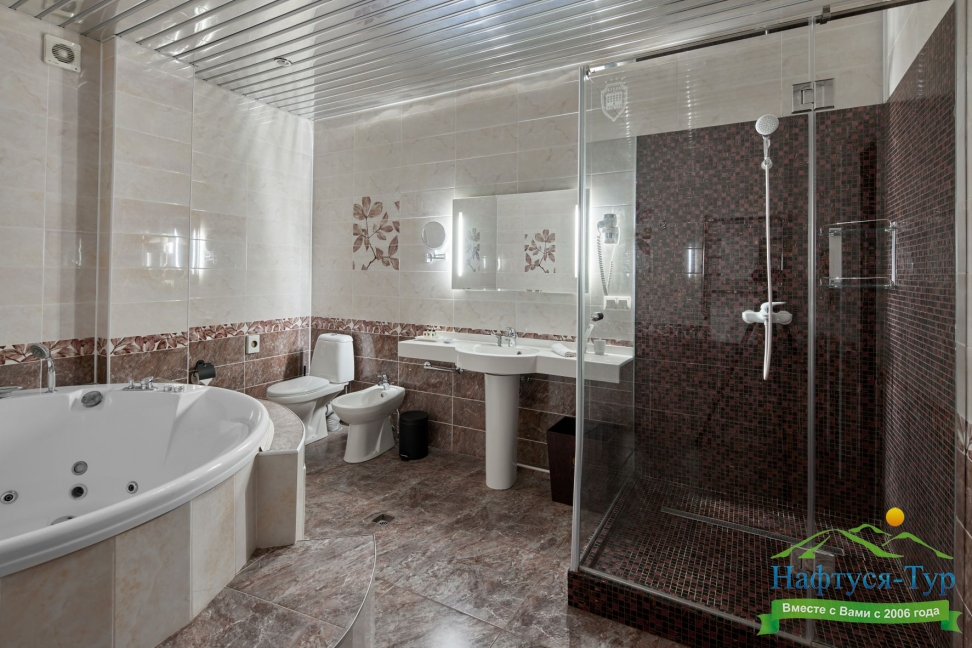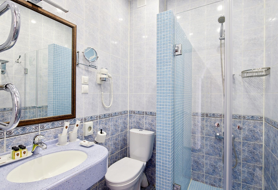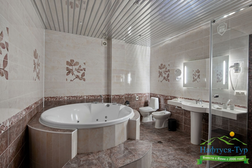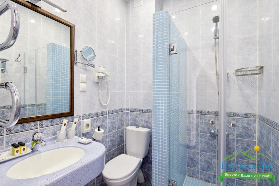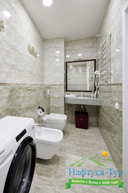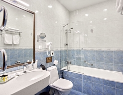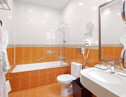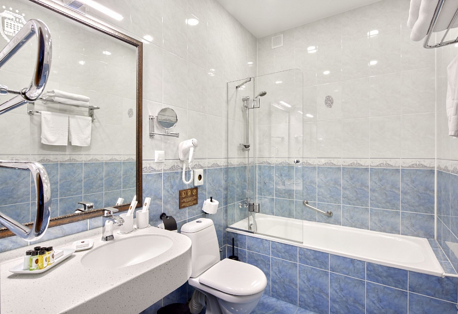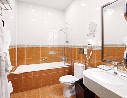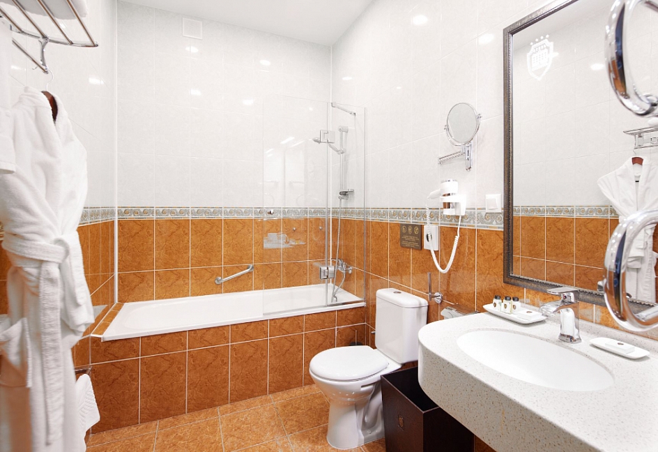 с ванной, тапочки, туалетные принадлежности, фен, халат