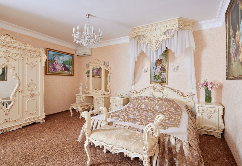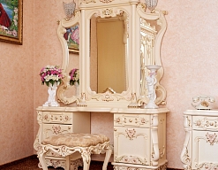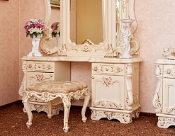 вешалка, диван, зеркало, кресло, кровать двуспальная, прикроватные тумбочки, столик журнальный, столик туалетный, шкаф