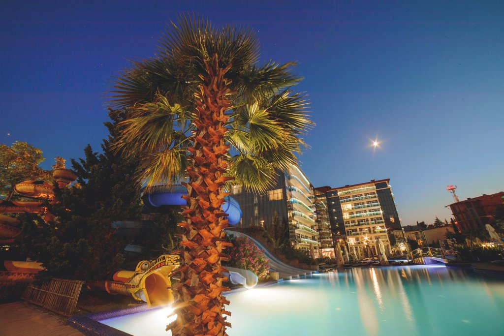комплекс бассейнов: 5 бассейнов: аквапарк (1500 кв.м), бассейн с пресной водой, подогреваемый бассейн с пресной водой, подогреваемый детский бассейн, морской бассейн.