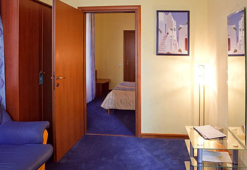 вешалка, диван, зеркало, кровати односпальные /одна двуспальная кровать, прикроватные тумбочки, стол, стулья, шкаф