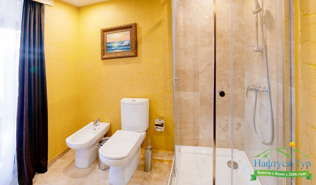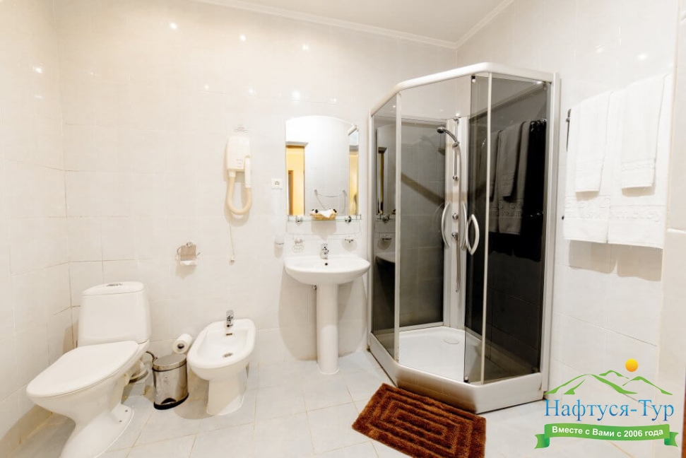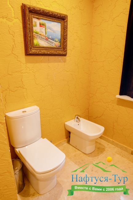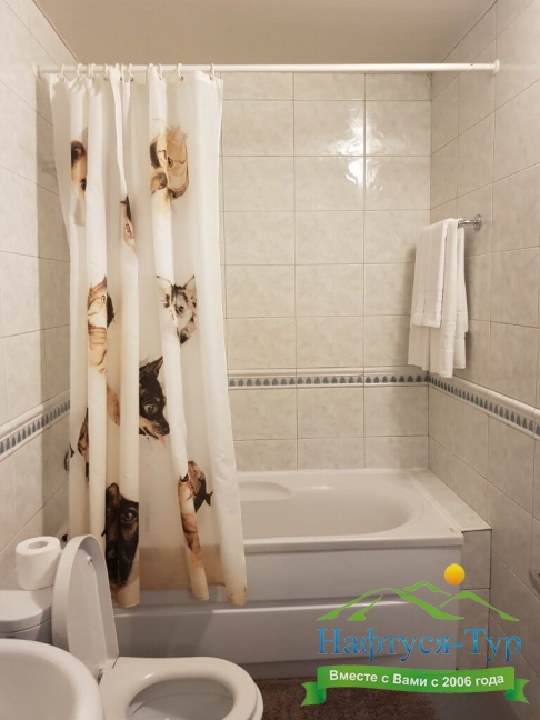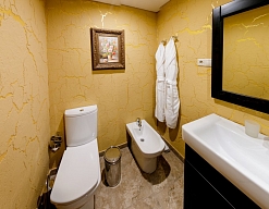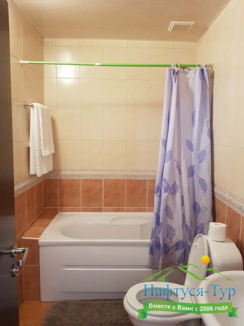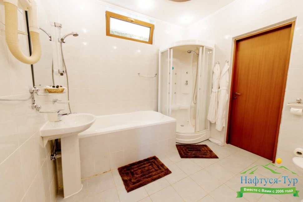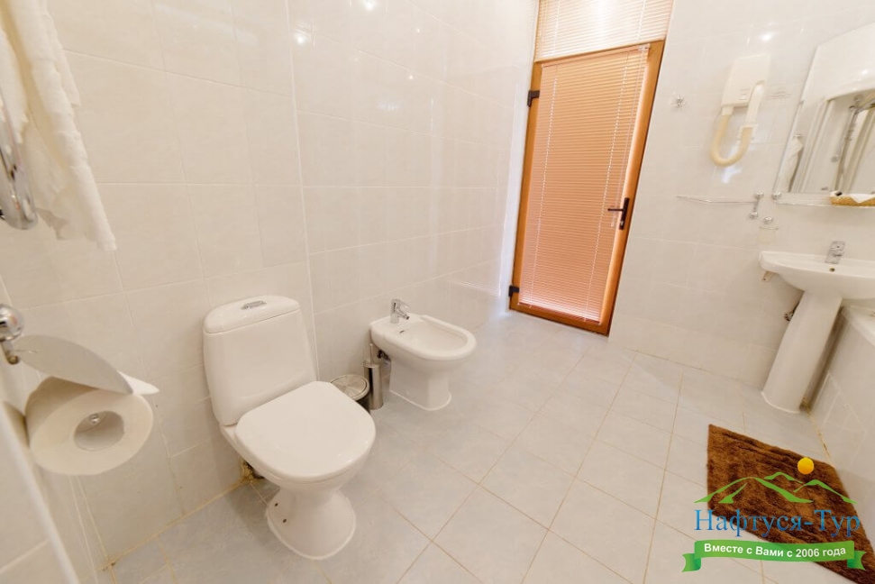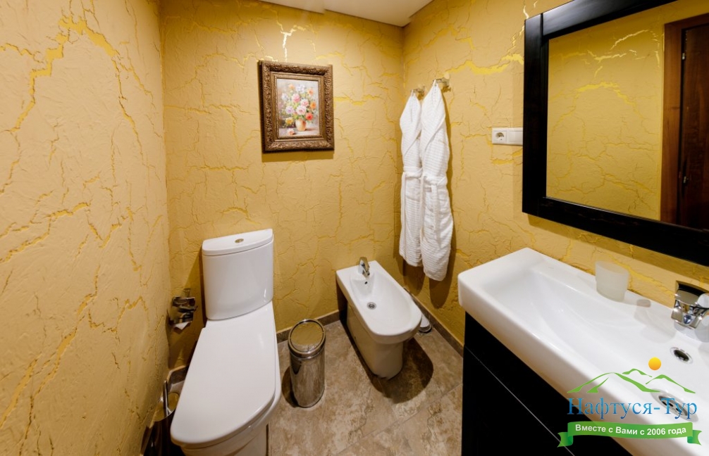2 санузла, 3 санузла, с ванной, с душем, тапочки, туалетные принадлежности, фен, халат