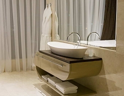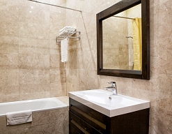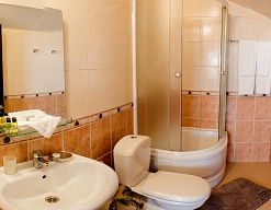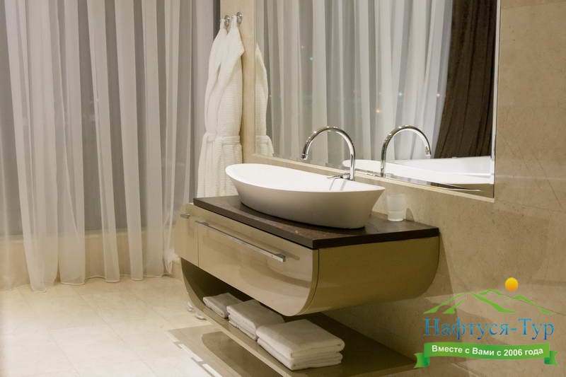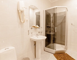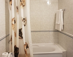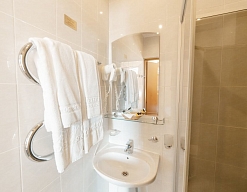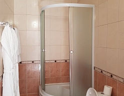 с ванной или душевой кабиной, тапочки, туалетные принадлежности, фен, халат