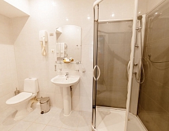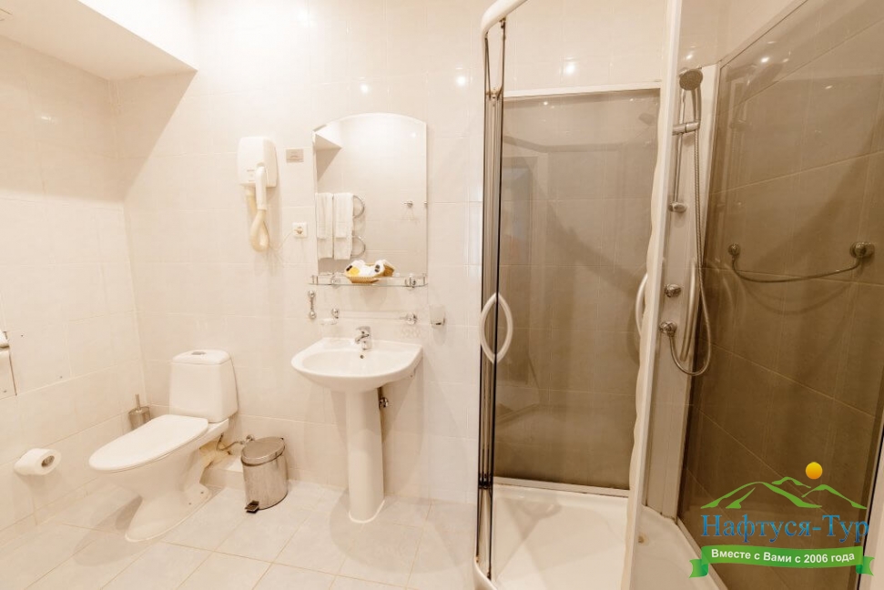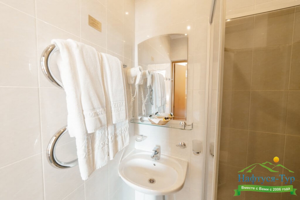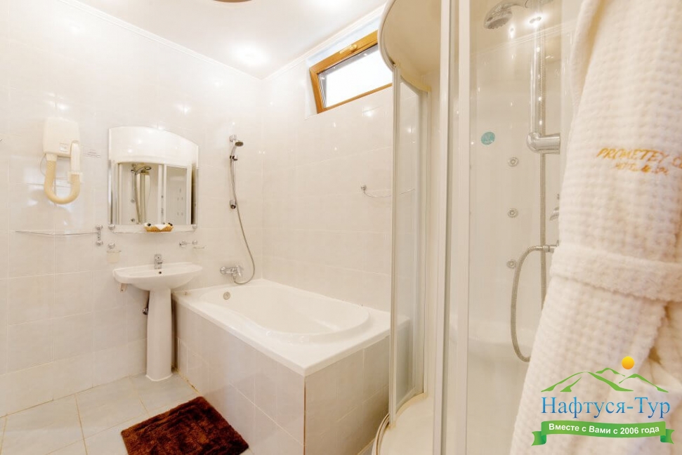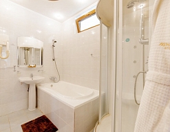 с ванной/душем, тапочки, туалетные принадлежности, фен, халат