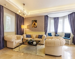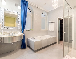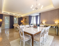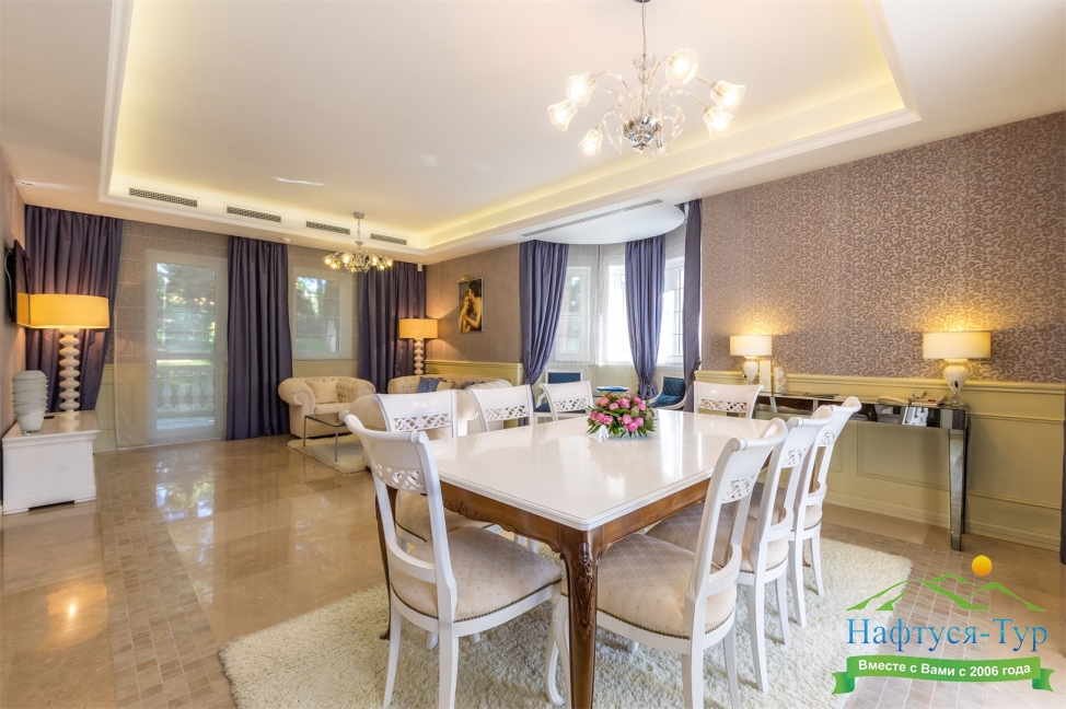В комфорте виллы “Золотая” предусмотрено все, что только могут пожелать ценители истинной роскоши. Красоту интерьера подчеркивает камин из итальянского мрамора «Микеланджело», элегантный текстиль, зеркала в деревянной рамке с золотой отделкой, и элитная сантехника c покрытием из 24-х каратного золота.
