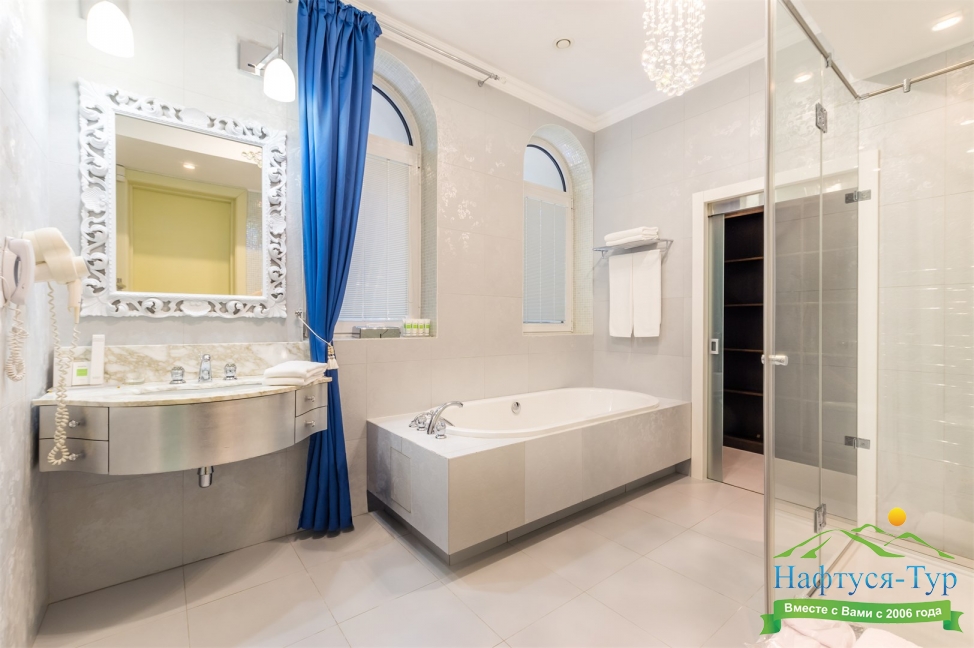 3 санузла, биде, с ванной, с душевой кабиной, тапочки, туалетные принадлежности, фен, халат