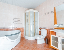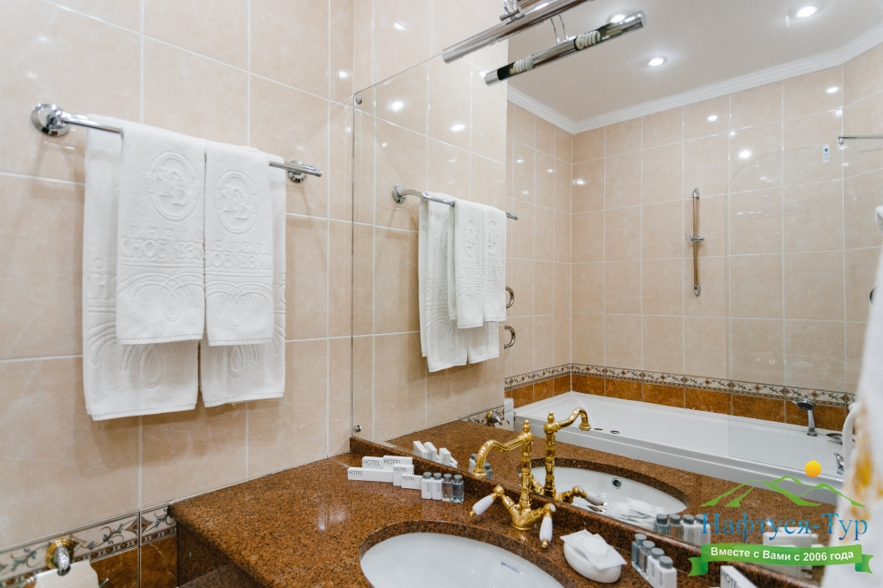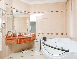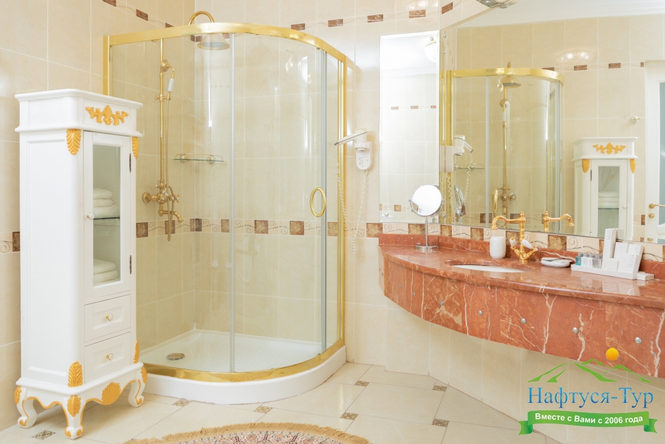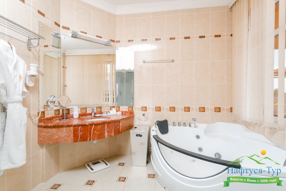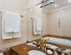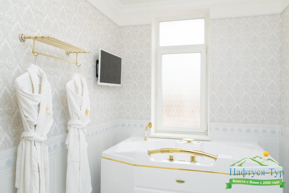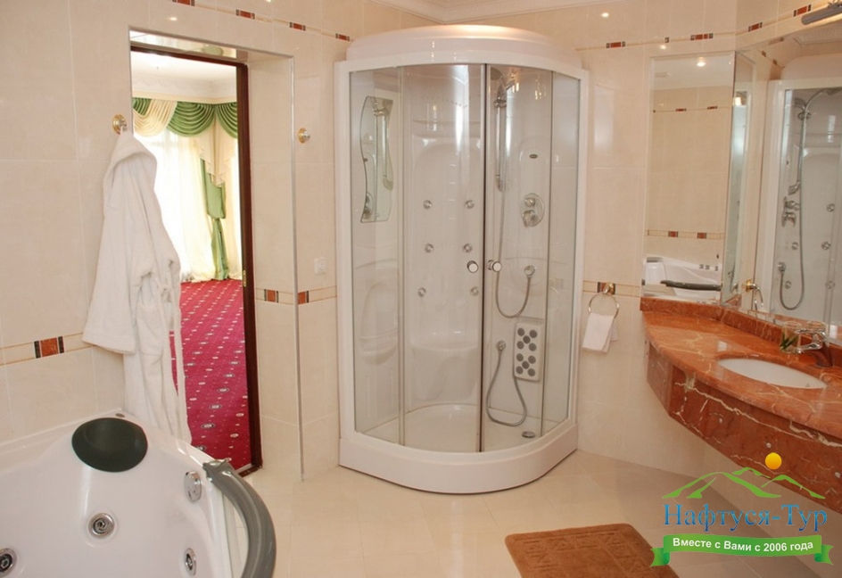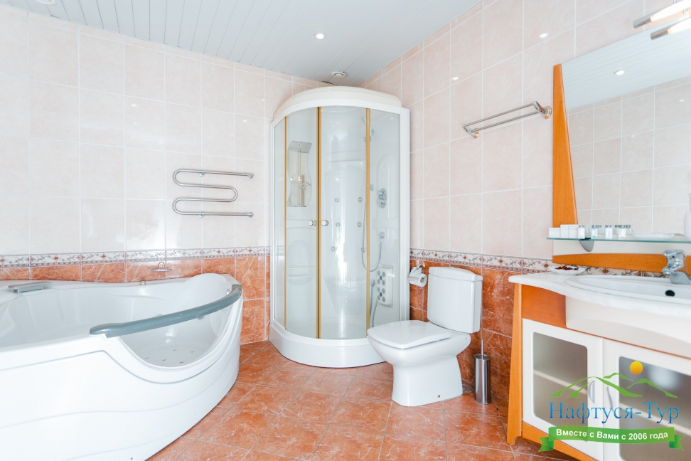 биде, с ванной, с джакузи, с душевой кабиной, тапочки, туалетные принадлежности, фен