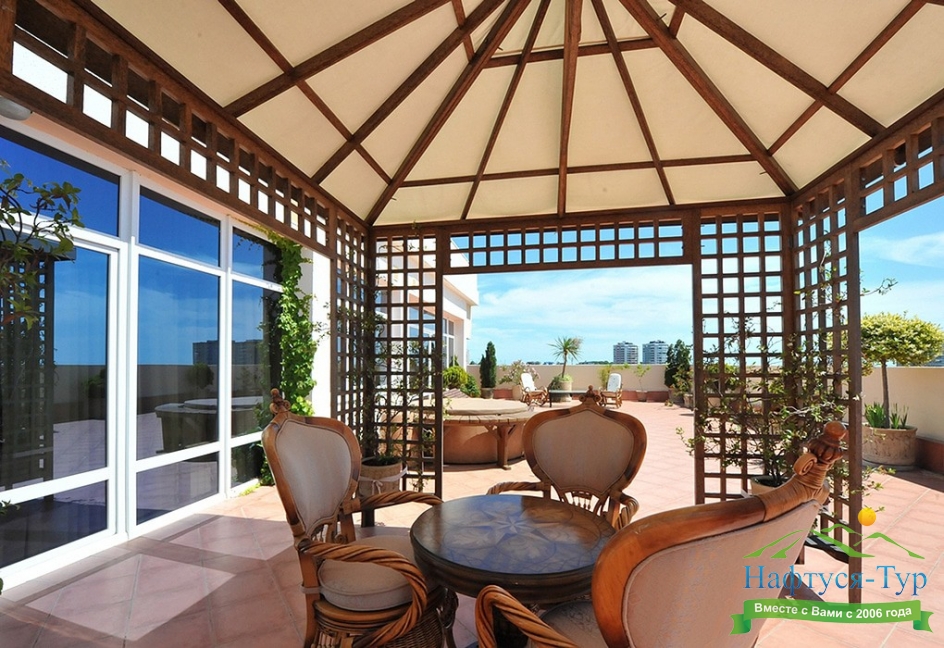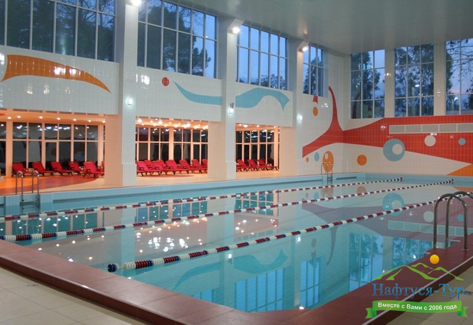 Крытый бассейн с подогреваемой морской водой. В бассейне работают 2 сауны - финская парная и турецкая(хамам), фито бар, душевые кабинки, зона отдыха с джакузи и лежаками.