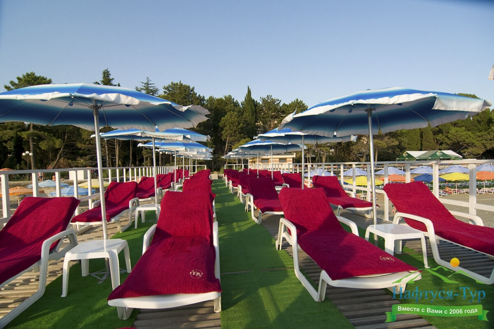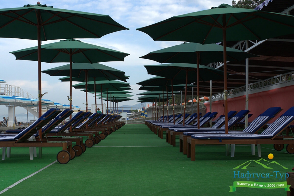 Бассейн оборудован шезлонгами, пляжными зонтами и душевыми кабинками.