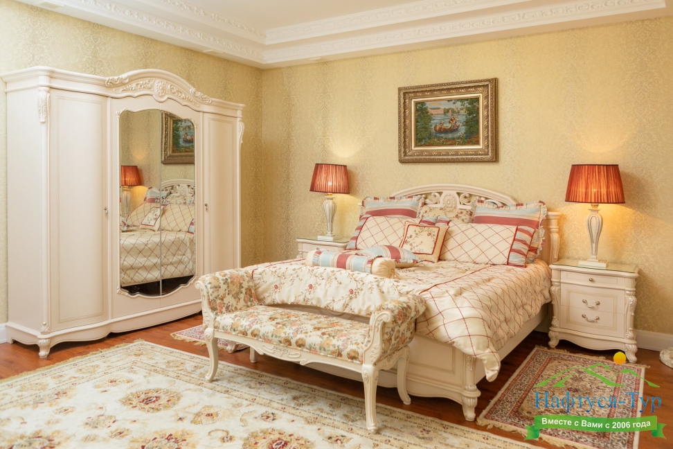 кровать двуспальная, прикроватные тумбочки, стол, стулья, тумба под телевизор, шкаф