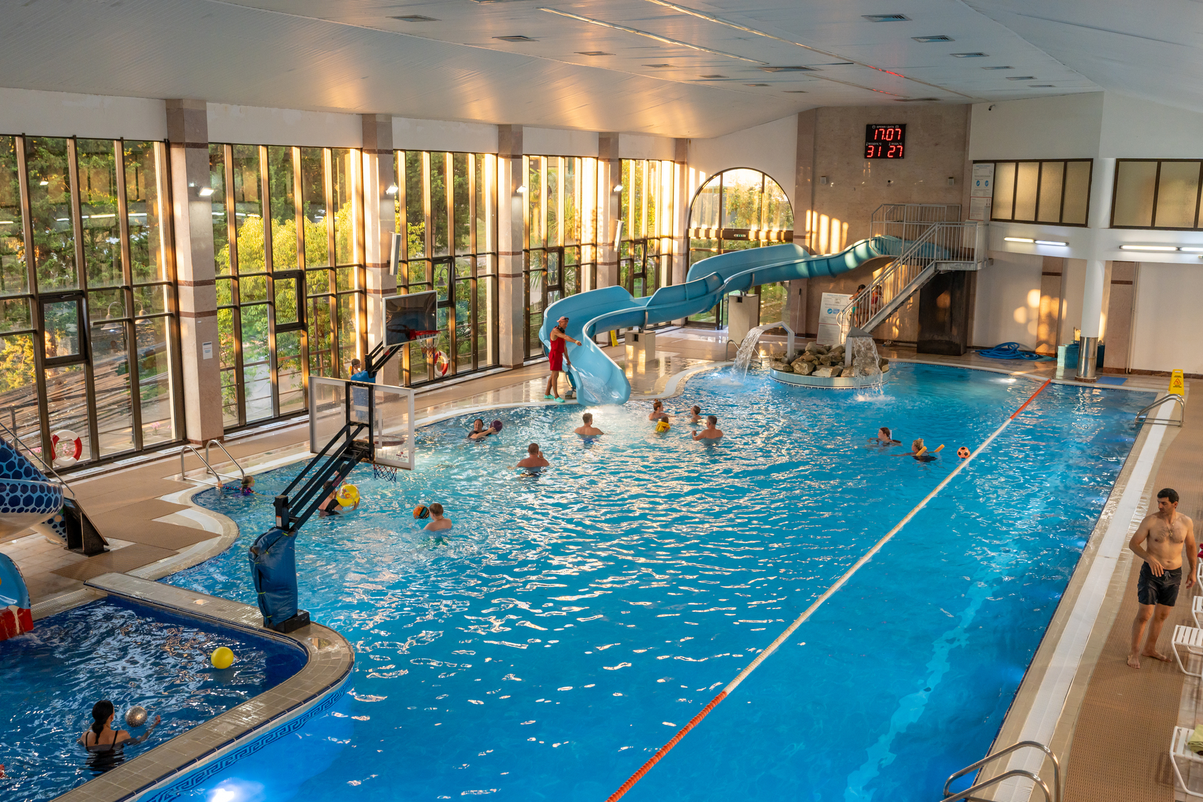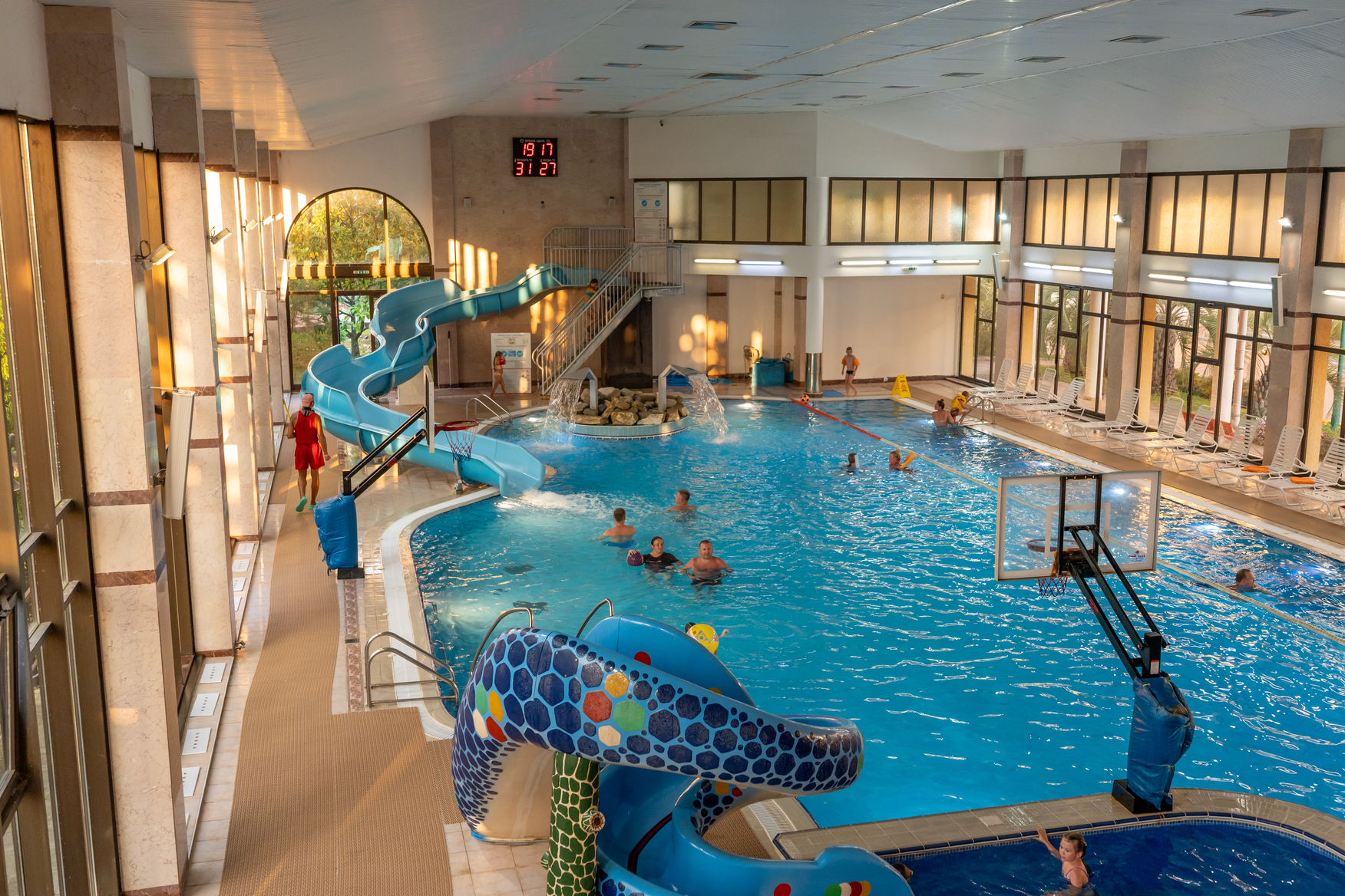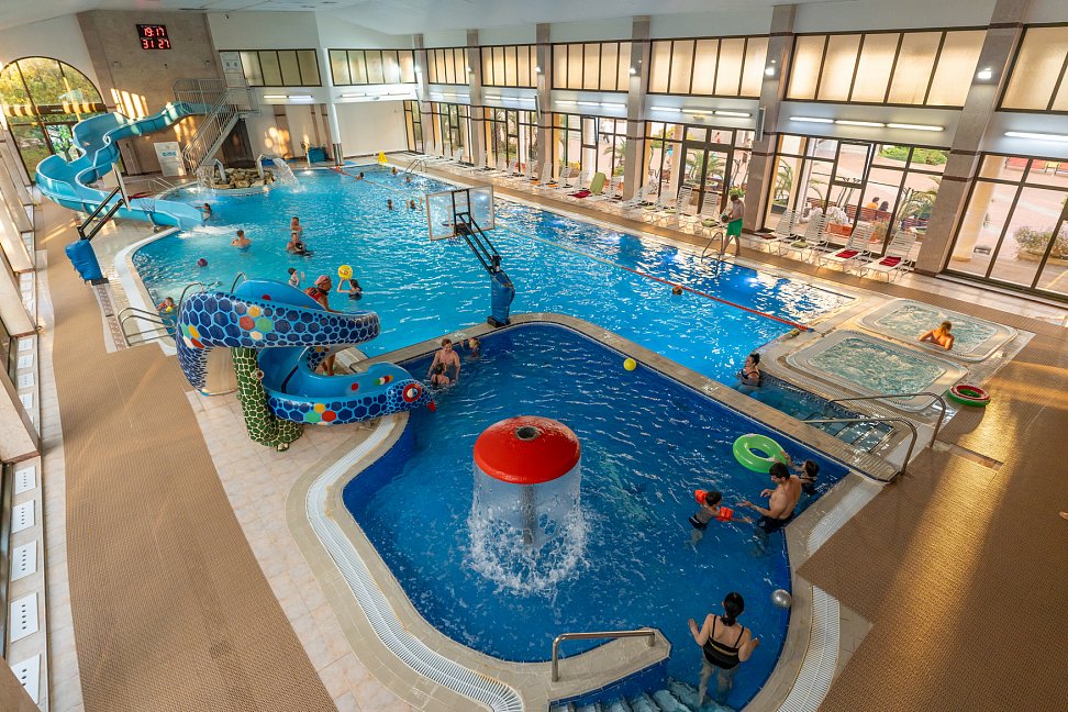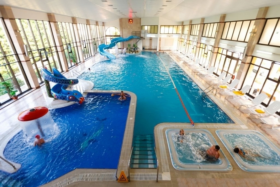 • Крытый плавательный комплекс с элементами аквапарка с пресной водой: взрослый бассейн: размер 30 х 12,5 м, глубина 0,9 до 2 м; детский бассейн: размер 6 х 6м, глубина 0,7м; джакузи, гейзеры, водный массаж, выдача полотенец.