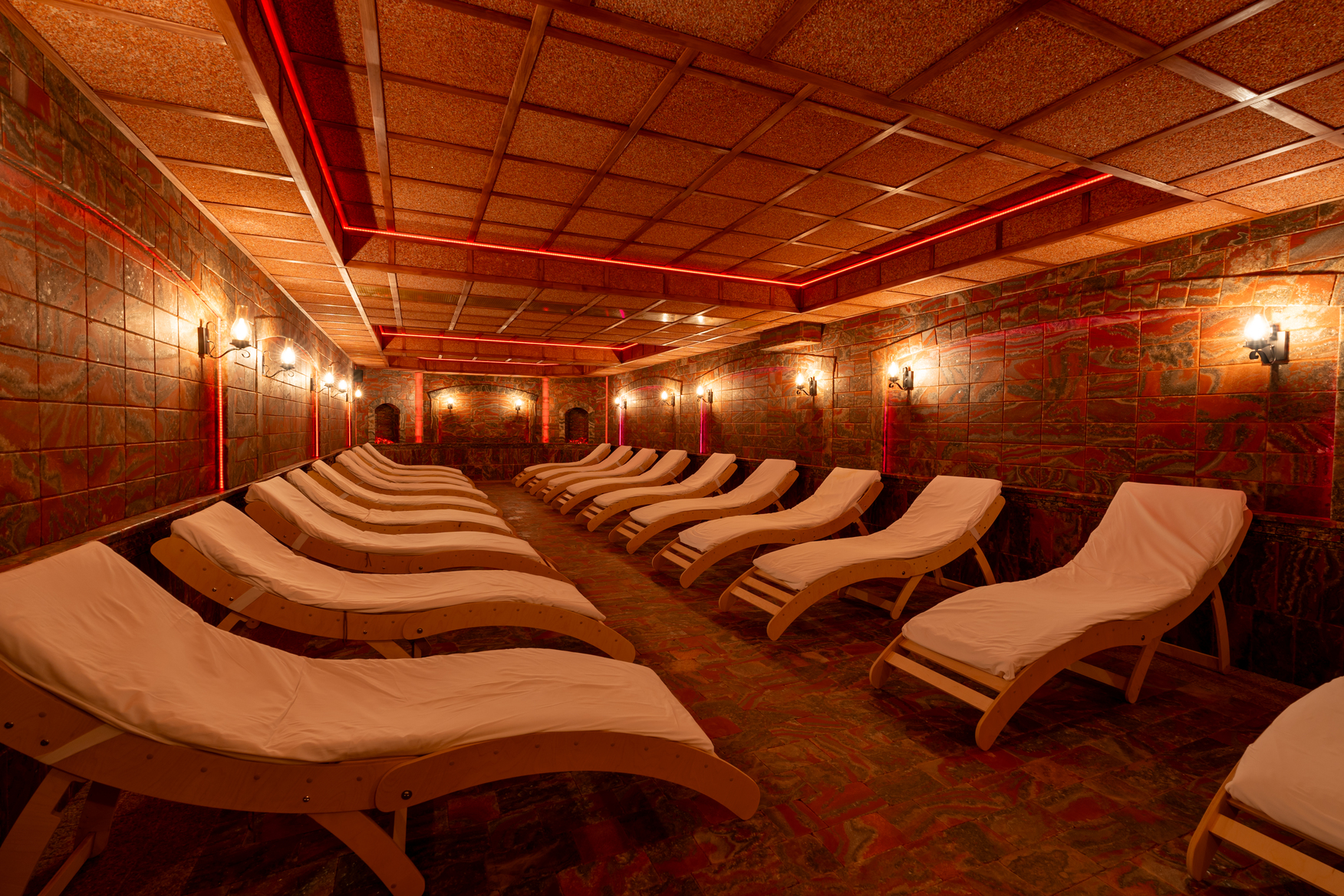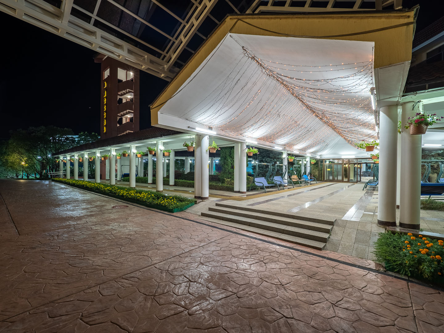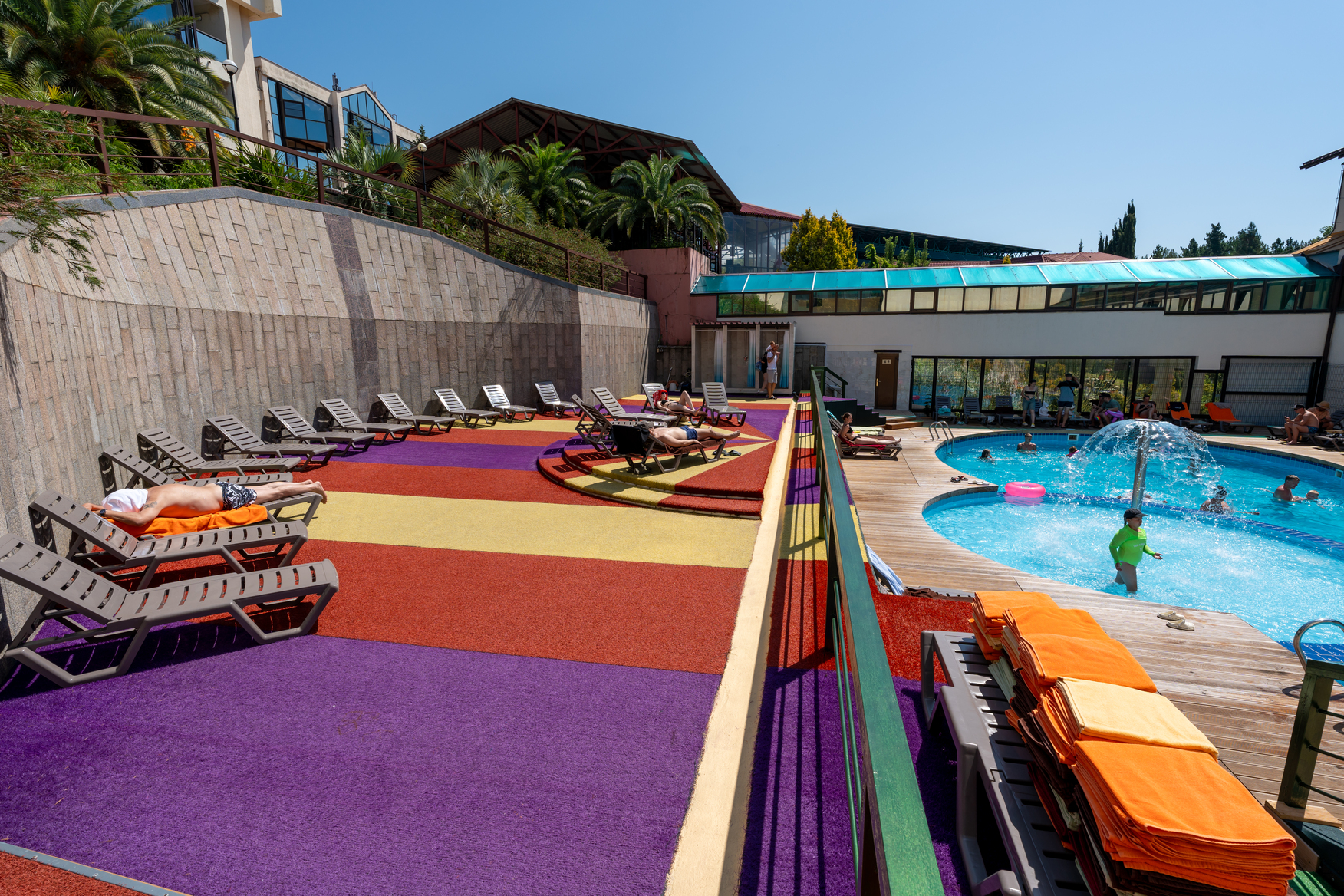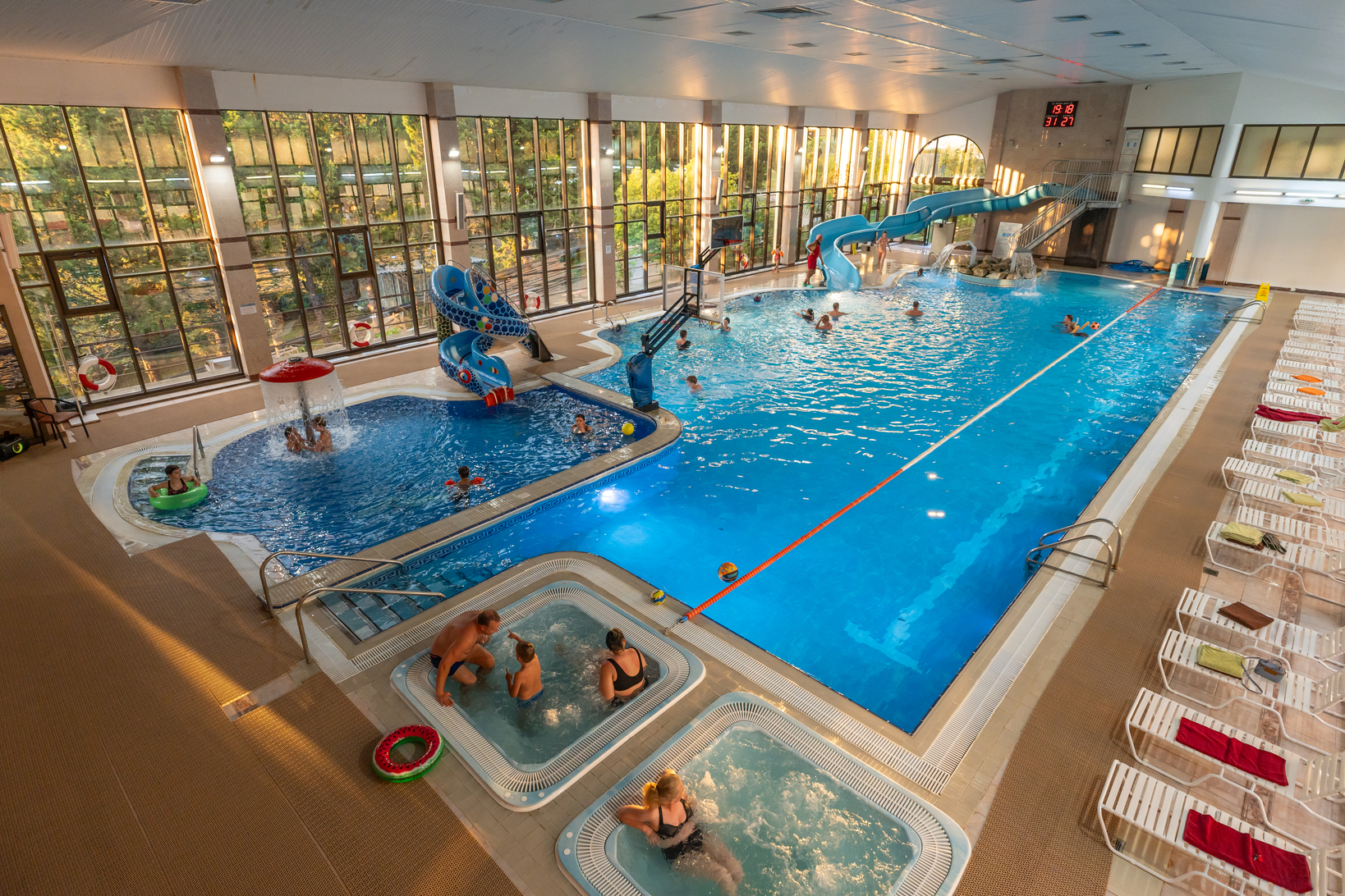 • Крытый плавательный комплекс с элементами аквапарка с пресной водой: взрослый бассейн: размер 30 х 12,5 м, глубина 0,9 до 2 м; детский бассейн: размер 6 х 6м, глубина 0,7м; джакузи, гейзеры, водный массаж, выдача полотенец.