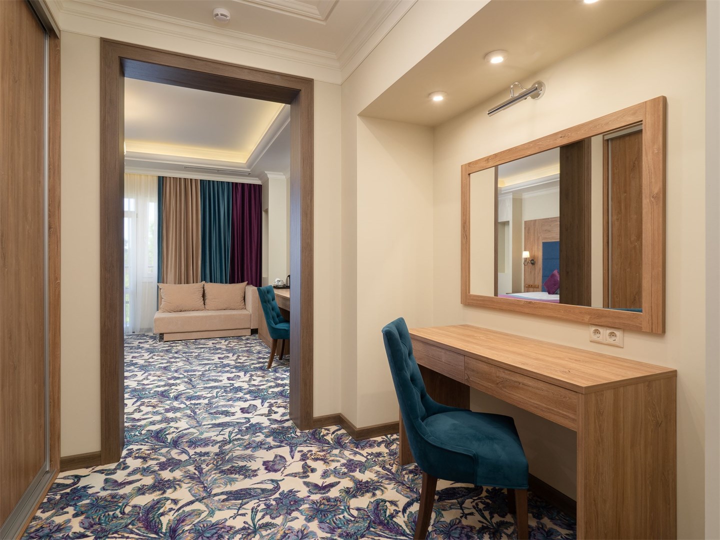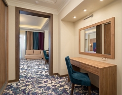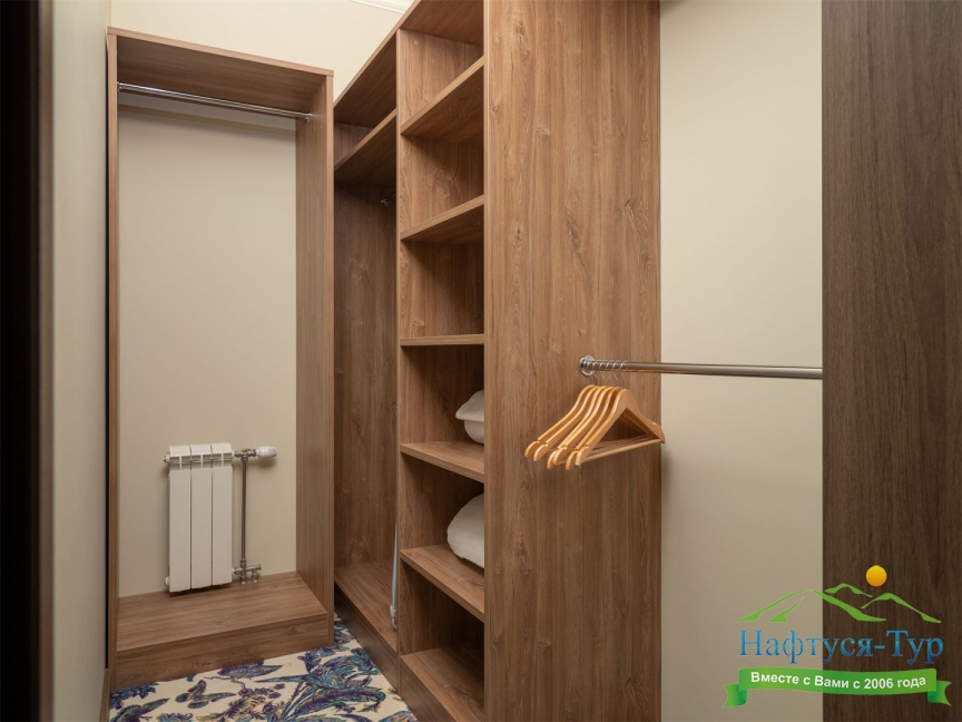 гардеробная, диван, еврораскладушка, зеркало, кровати односпальные /одна двуспальная кровать, прикроватные тумбочки, стол, столик туалетный, стул, шкаф