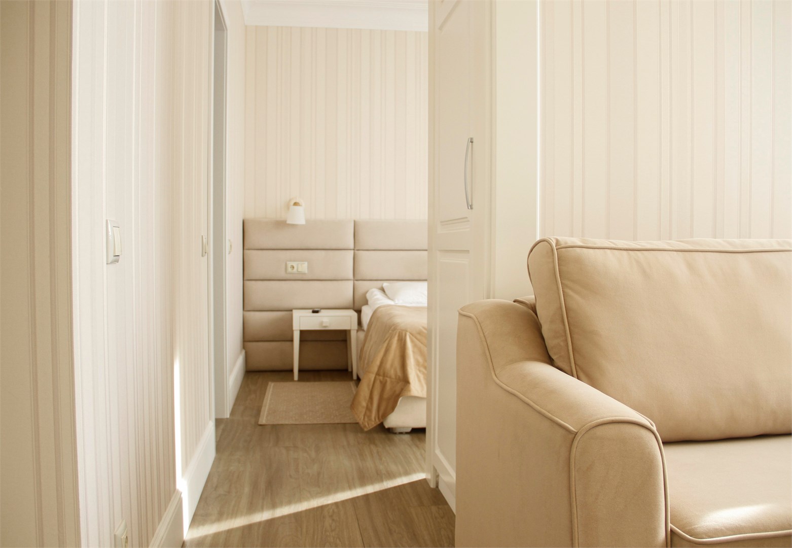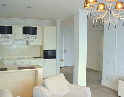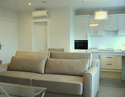 гардеробная, диван раскладной, кровать двуспальная, кухонная мебель, прикроватные тумбочки, пуфик, стол, стулья
