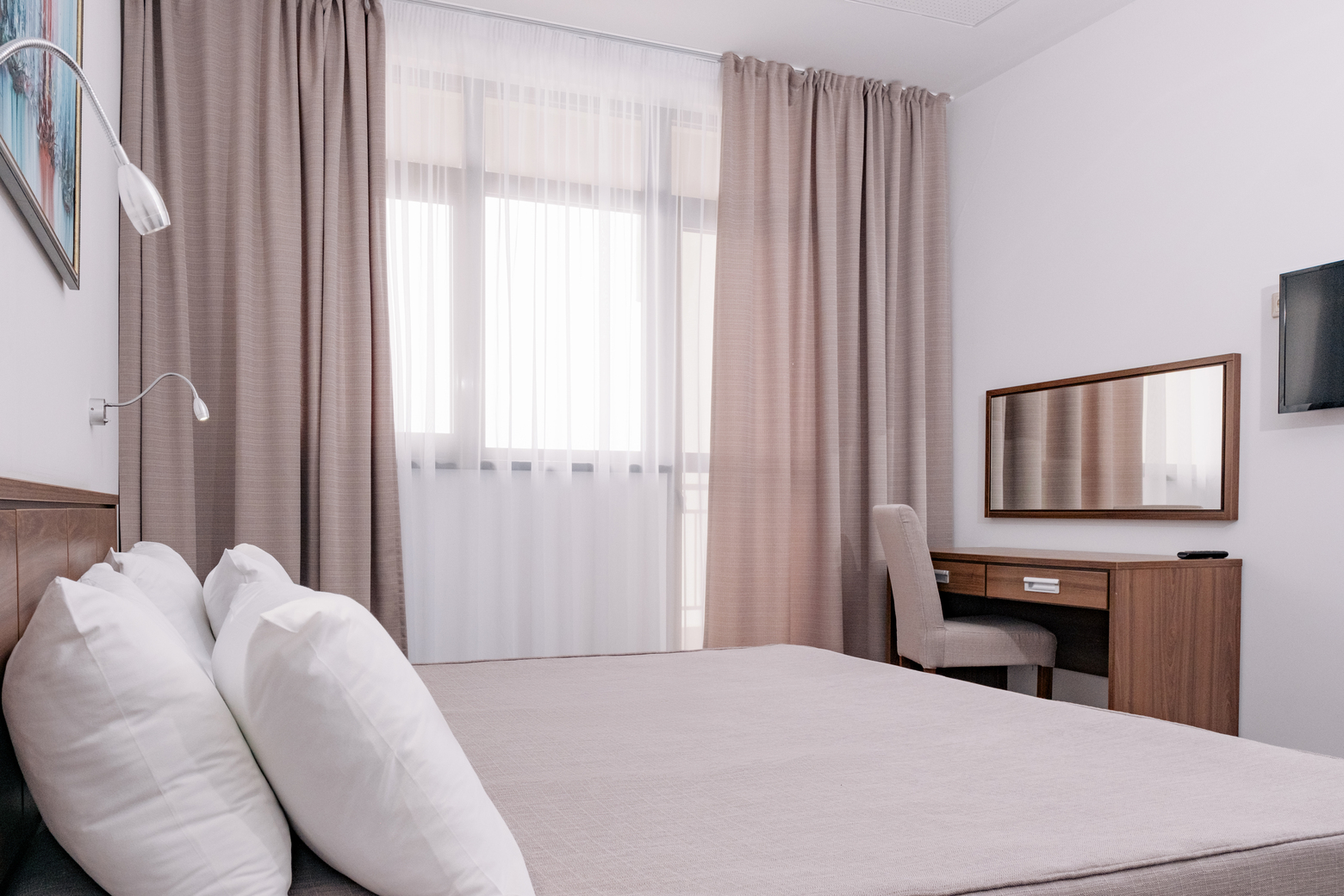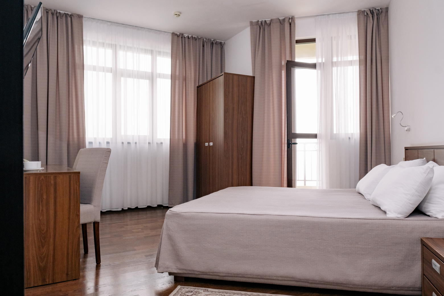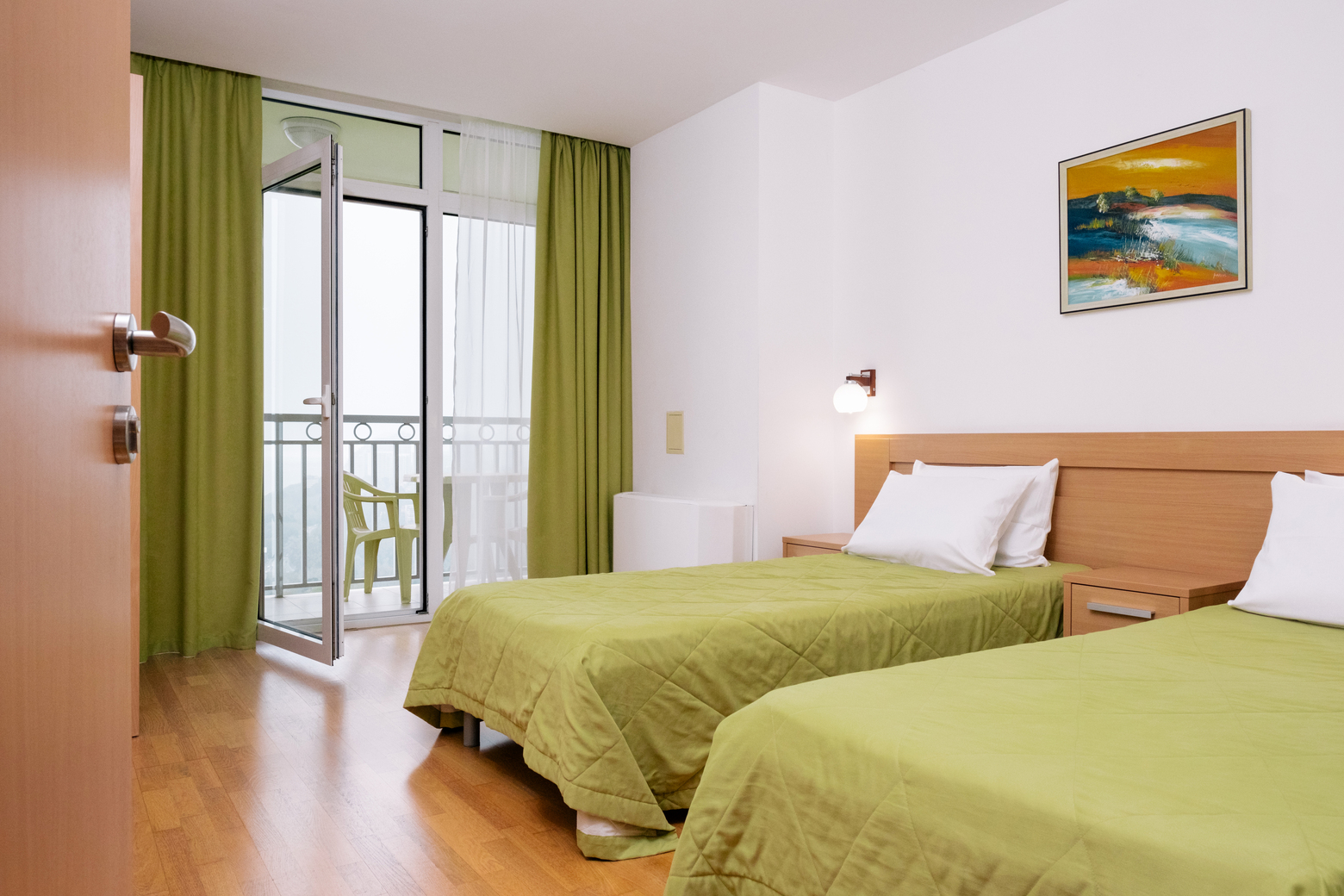 кровати односпальные /одна двуспальная кровать, прикроватные тумбочки, стол, стулья, шкаф