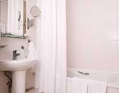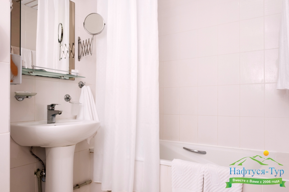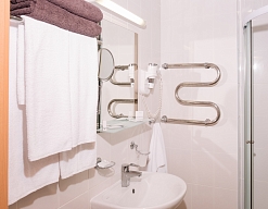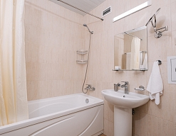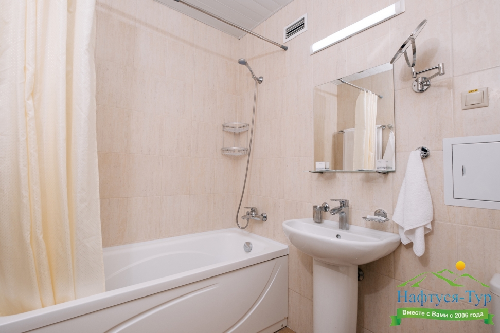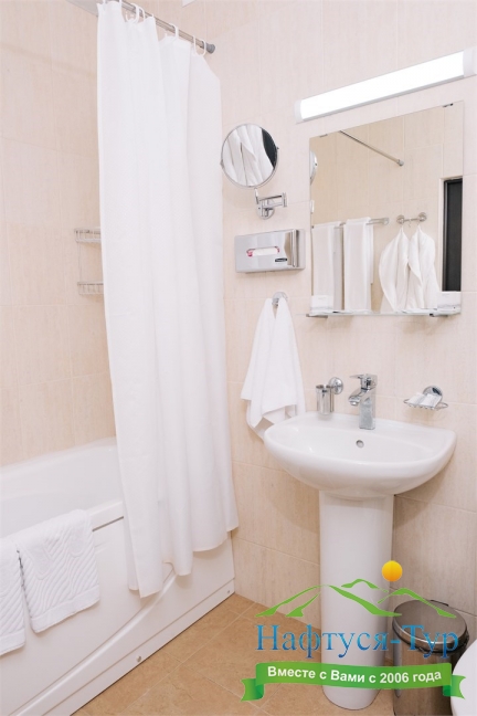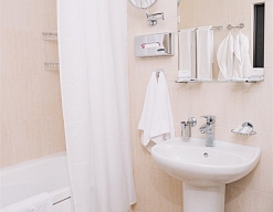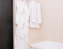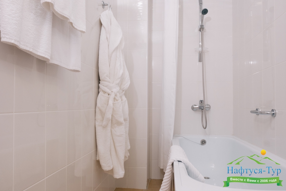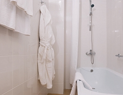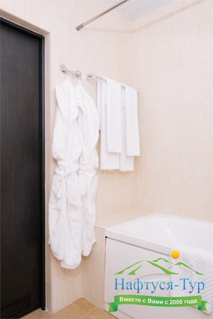 с ванной или душевой кабиной, тапочки, туалетные принадлежности, фен, халат