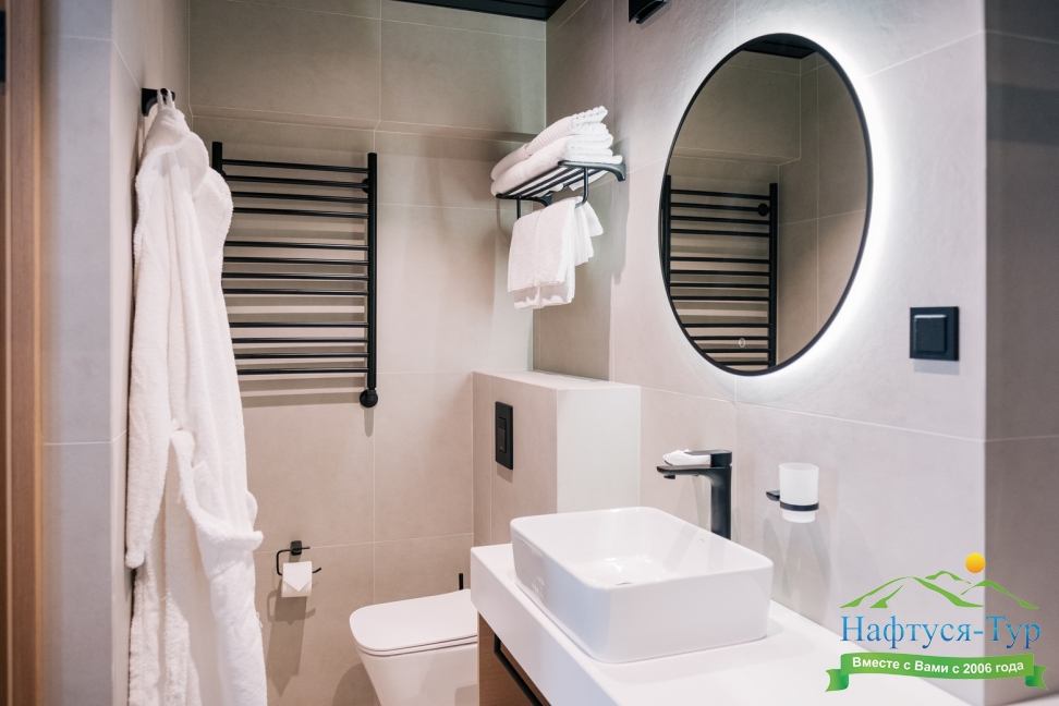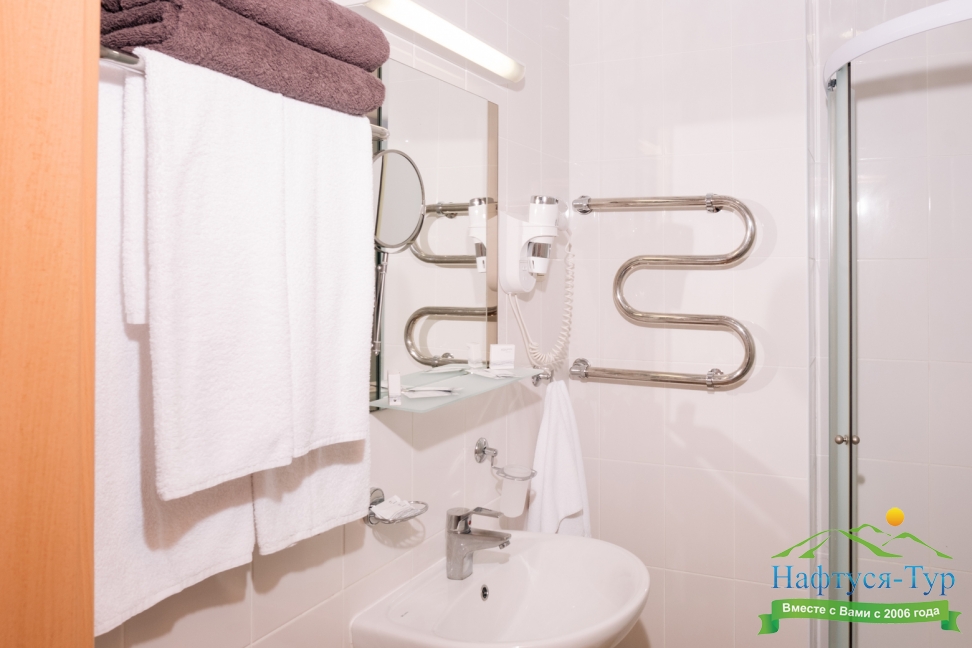 с душем, тапочки, туалетные принадлежности, фен, халат