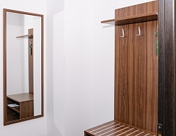 вешалка, диван, зеркало, кровать двуспальная, прикроватные тумбочки, стол, стулья, шкаф