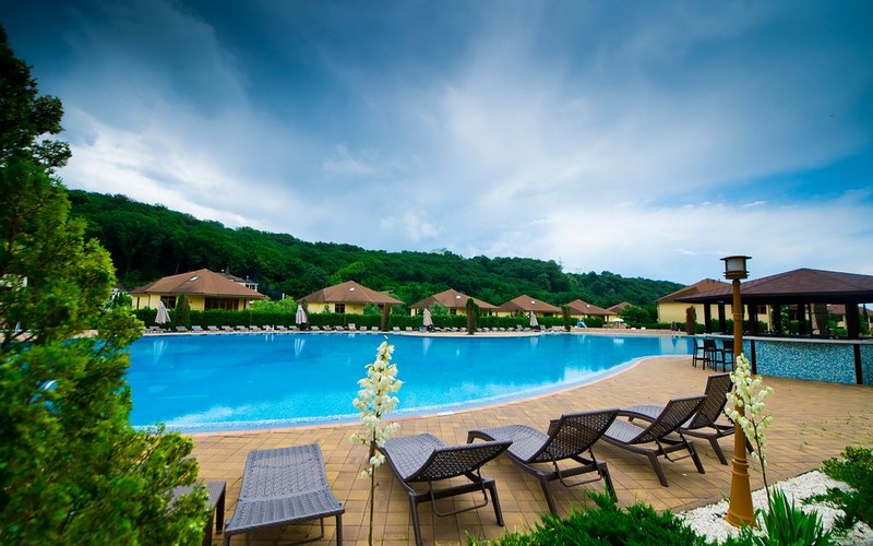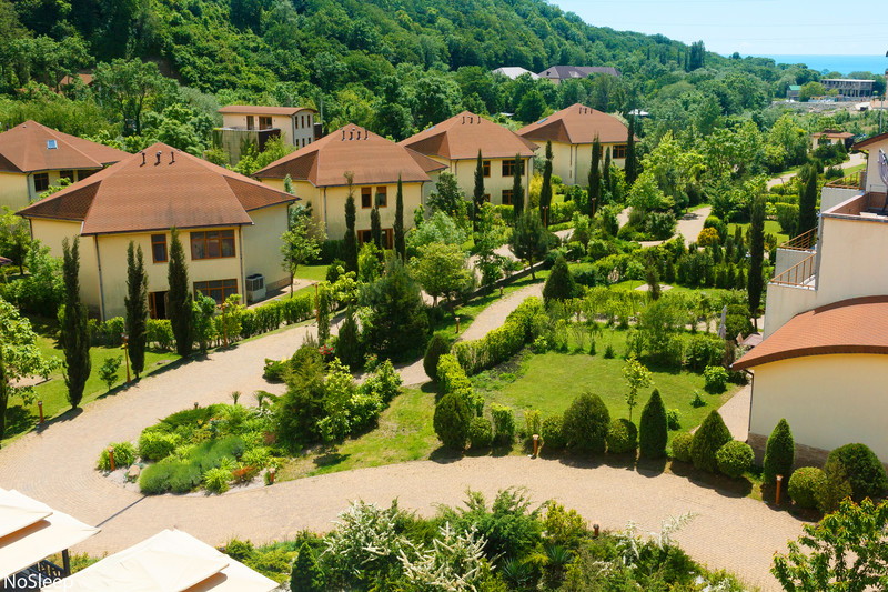 9 жилых корпусов расположены вдоль красивой горной речки, образовавшейся из многочисленных родников чистейшей воды, впадающей в море и находящейся в тени густых лиственных деревьев, что делает атмосферу пребывания неповторимой - на переходе морского и лесного воздуха. Территория площадью 3 га огорожена, благоустроеннаю
