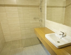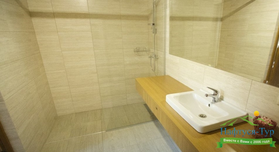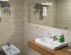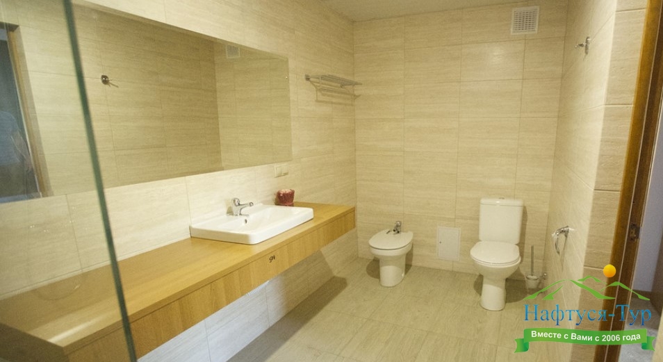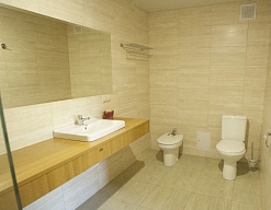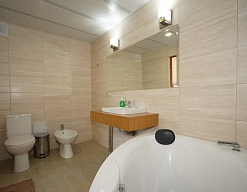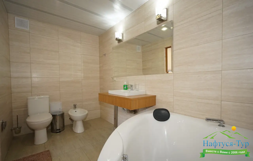 с ванной, тапочки, туалетные принадлежности, фен, халат