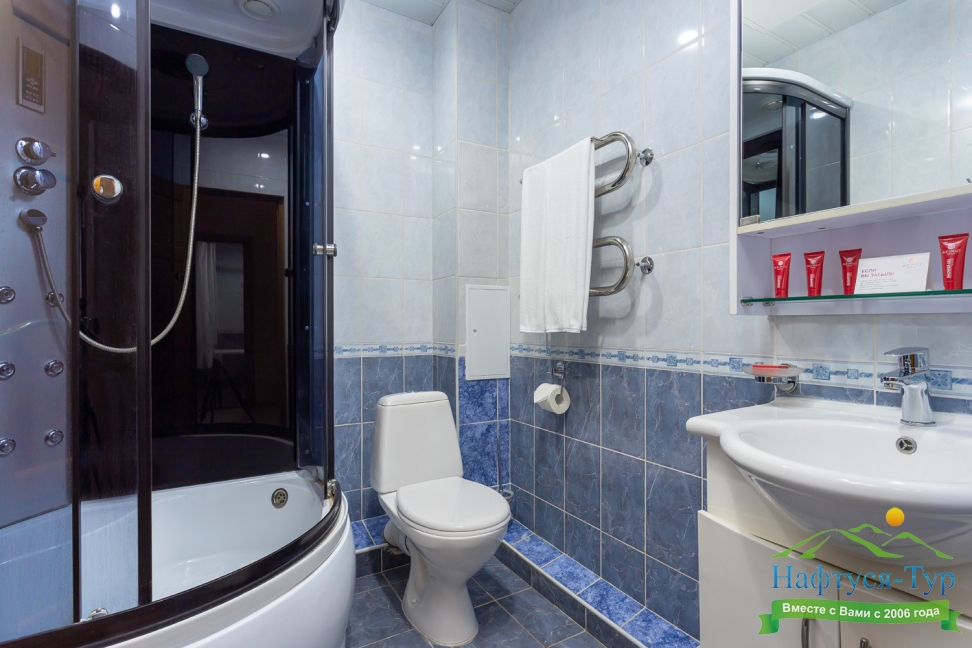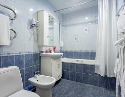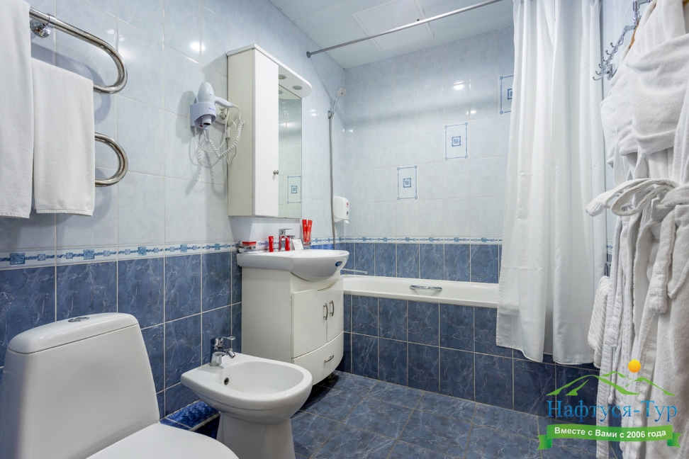 2 санузла, биде, с ванной, с душевой кабиной, тапочки, туалетные принадлежности, фен, халат