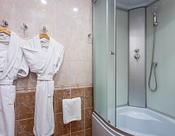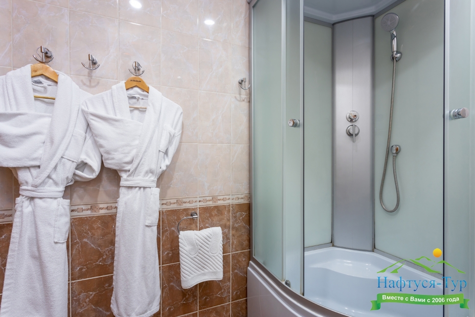 с душевой кабиной, тапочки, туалетные принадлежности, фен, халат