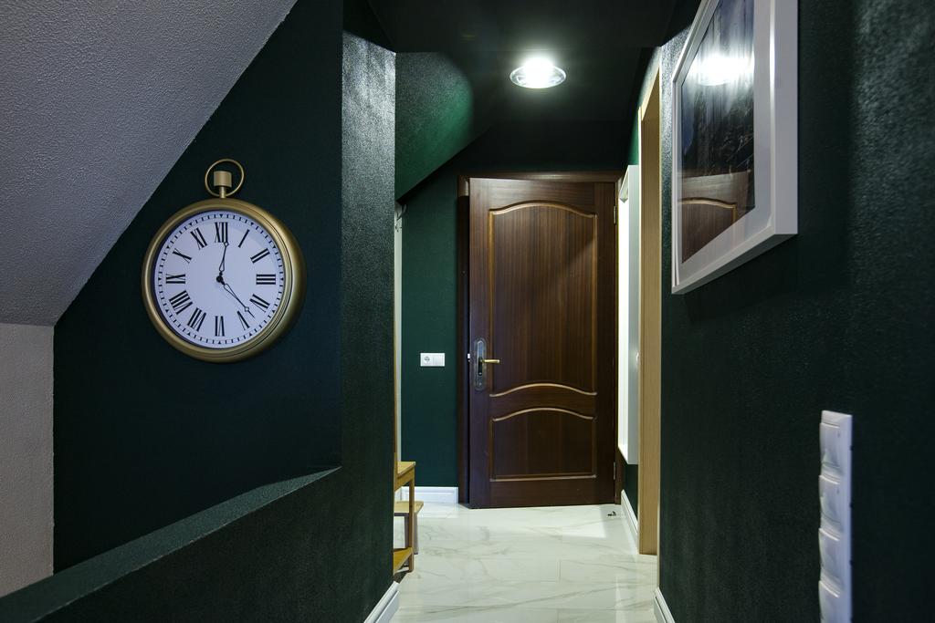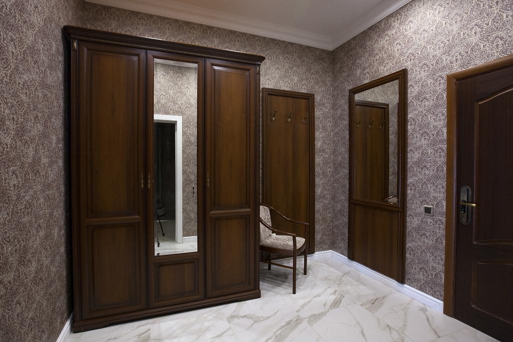 вешалка, диван, зеркало, кровать двуспальная, прикроватные тумбочки, стол, стулья, шкаф