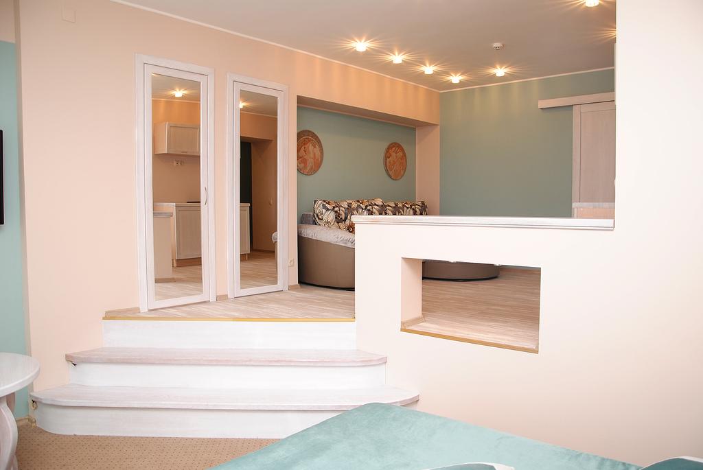 вешалка, диван раскладной, зеркало, кровать двуспальная/ две полутороспальные кровати, прикроватные тумбочки, стол, стулья, шкаф