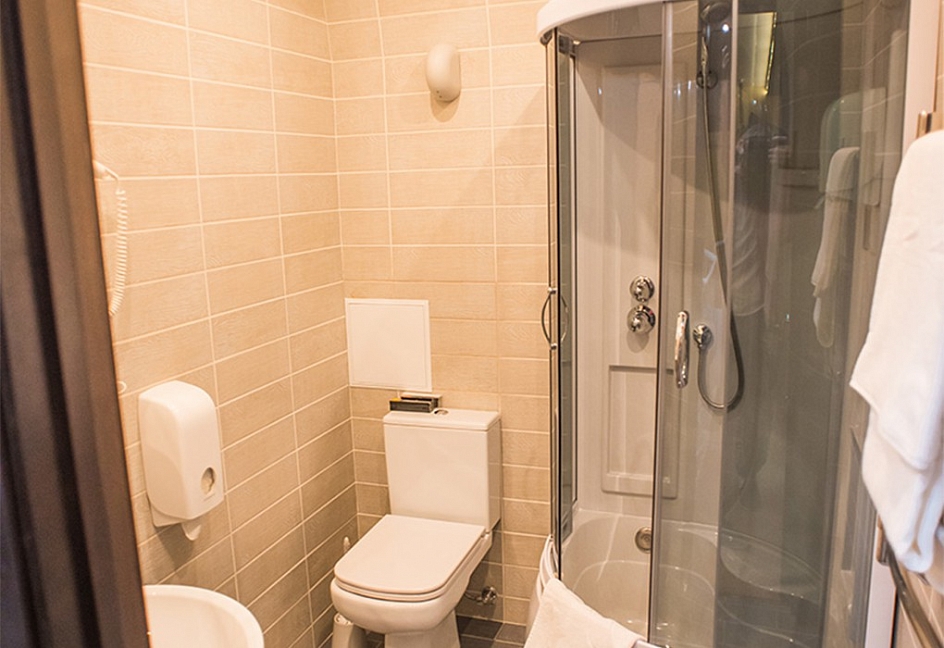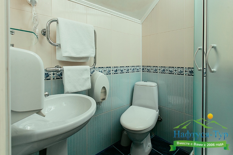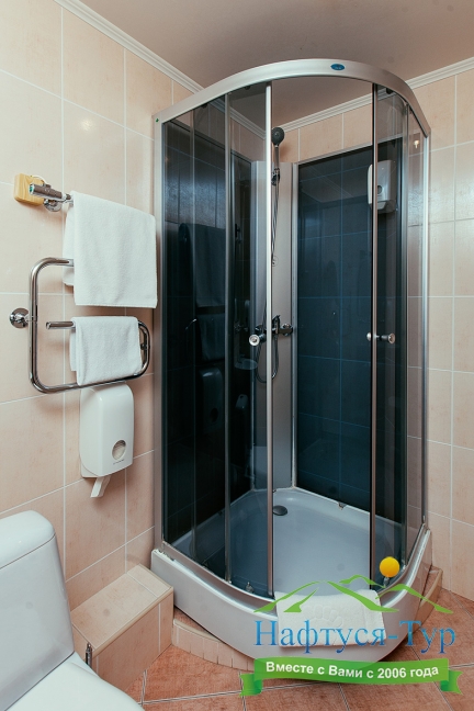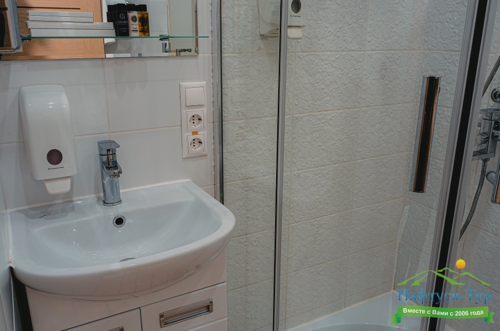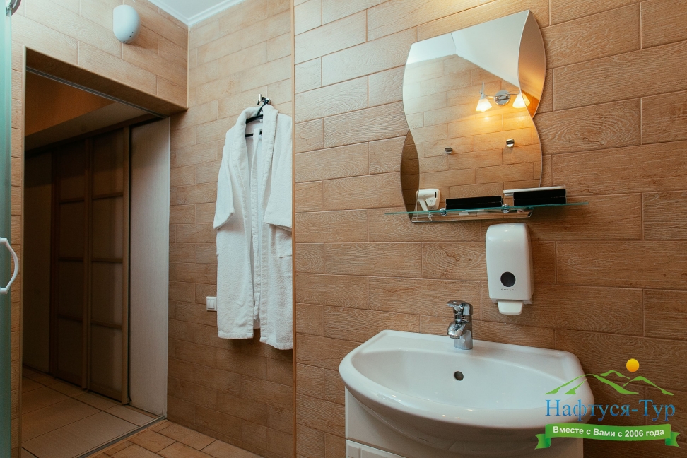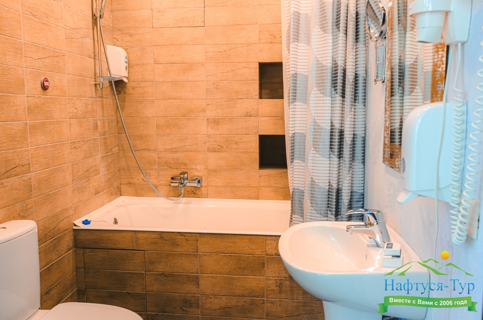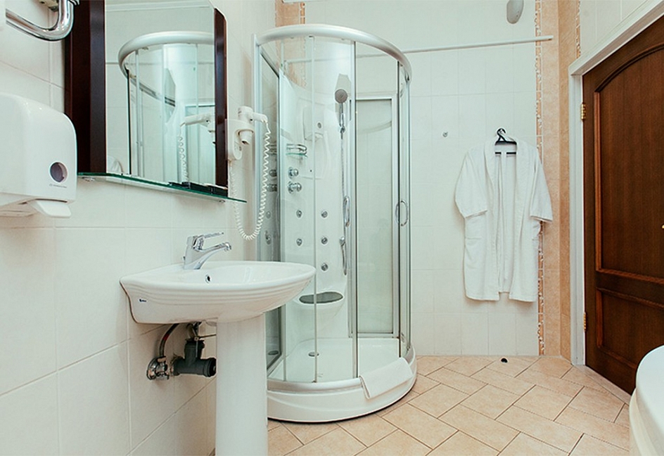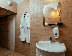 с ванной и душевой кабиной, тапочки, туалетные принадлежности, фен, халат