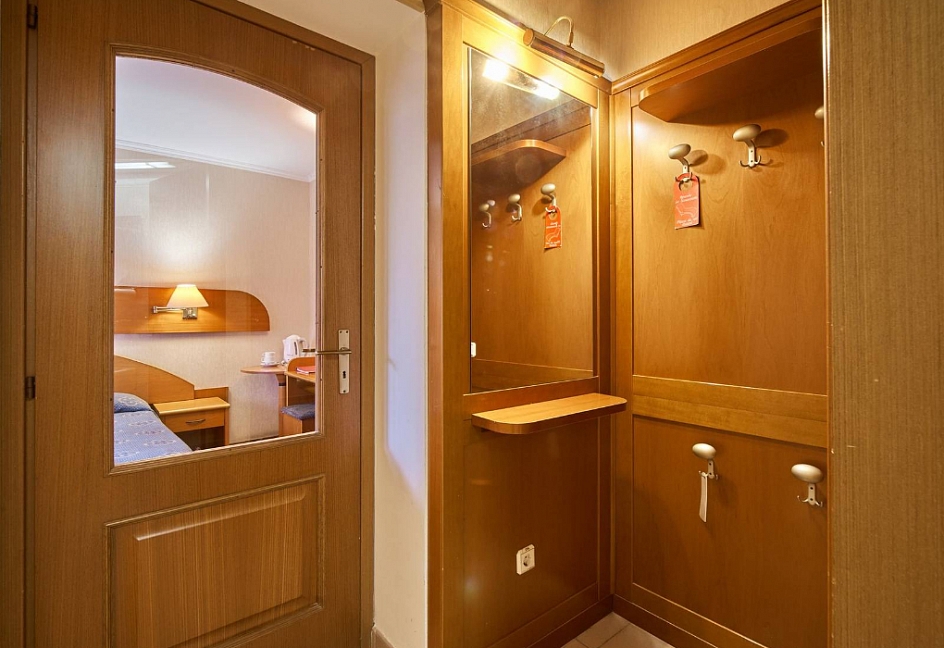 вешалка, зеркало, кровати односпальные, прикроватные тумбочки, стол, столик туалетный, стулья, шкаф