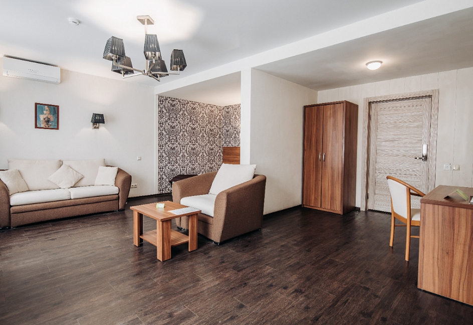 кресло-кровать, кровать двуспальная, прикроватные тумбочки, стол, столик журнальный, стулья, шкаф