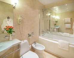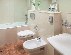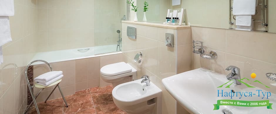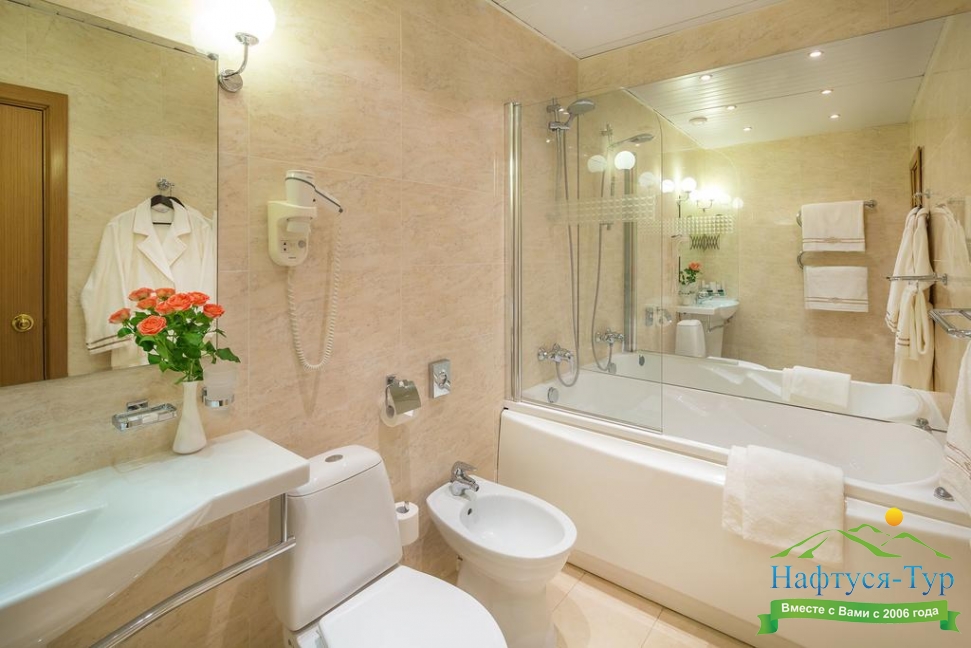 биде, с ванной, тапочки, туалетные принадлежности, фен, халат