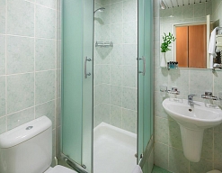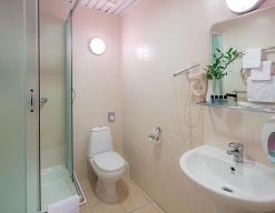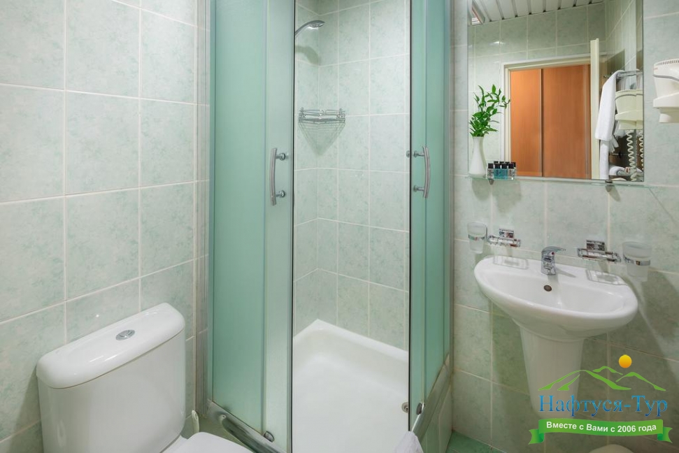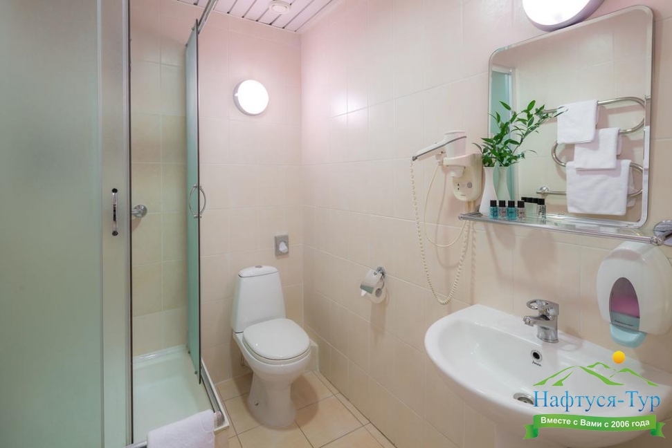 с душевой кабиной, тапочки, туалетные принадлежности, фен