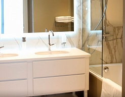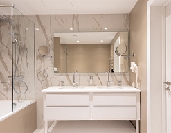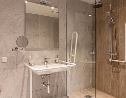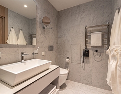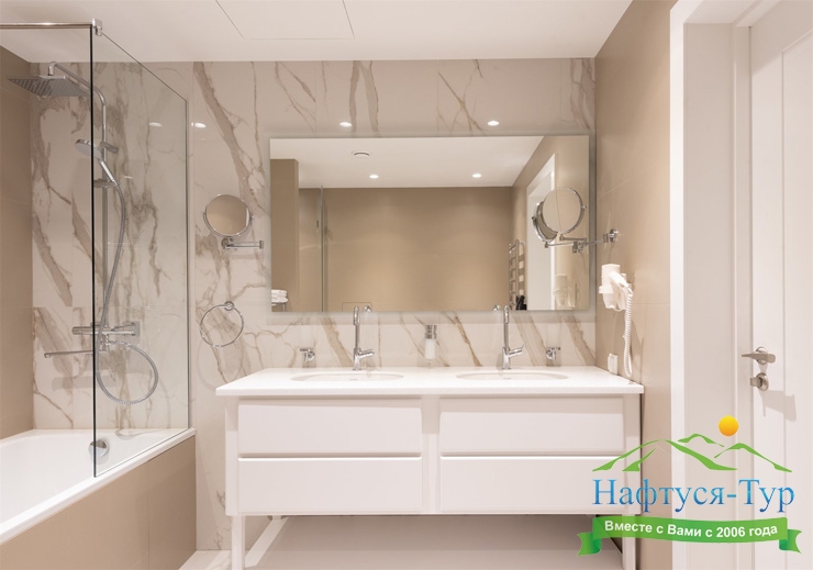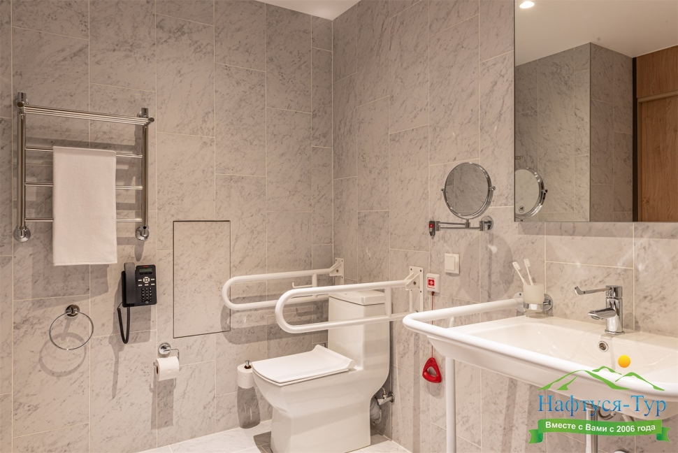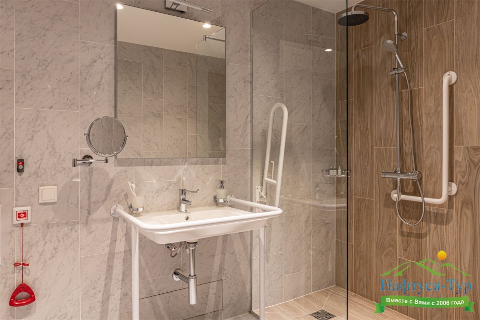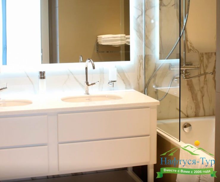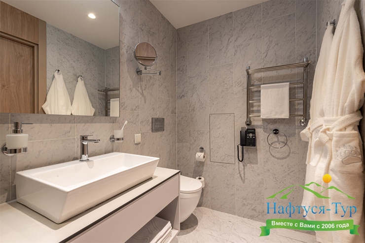 с ванной и душевой кабиной, тапочки, туалетные принадлежности, фен