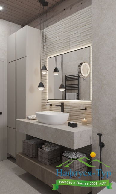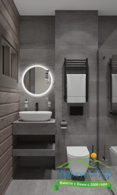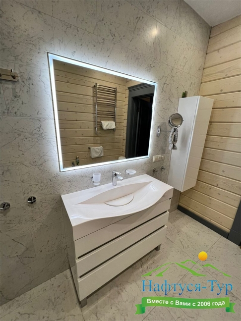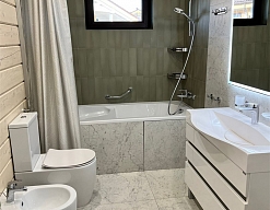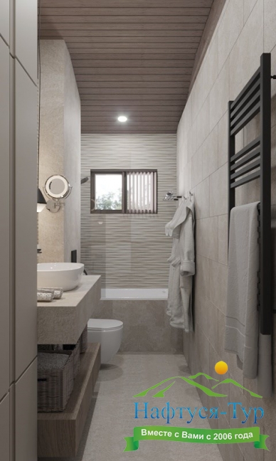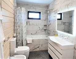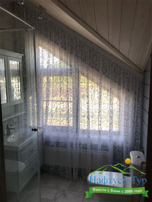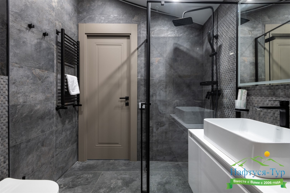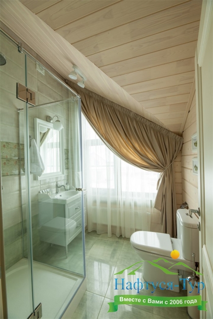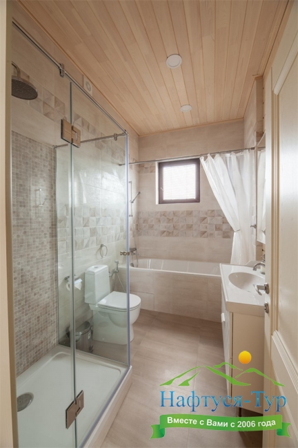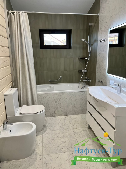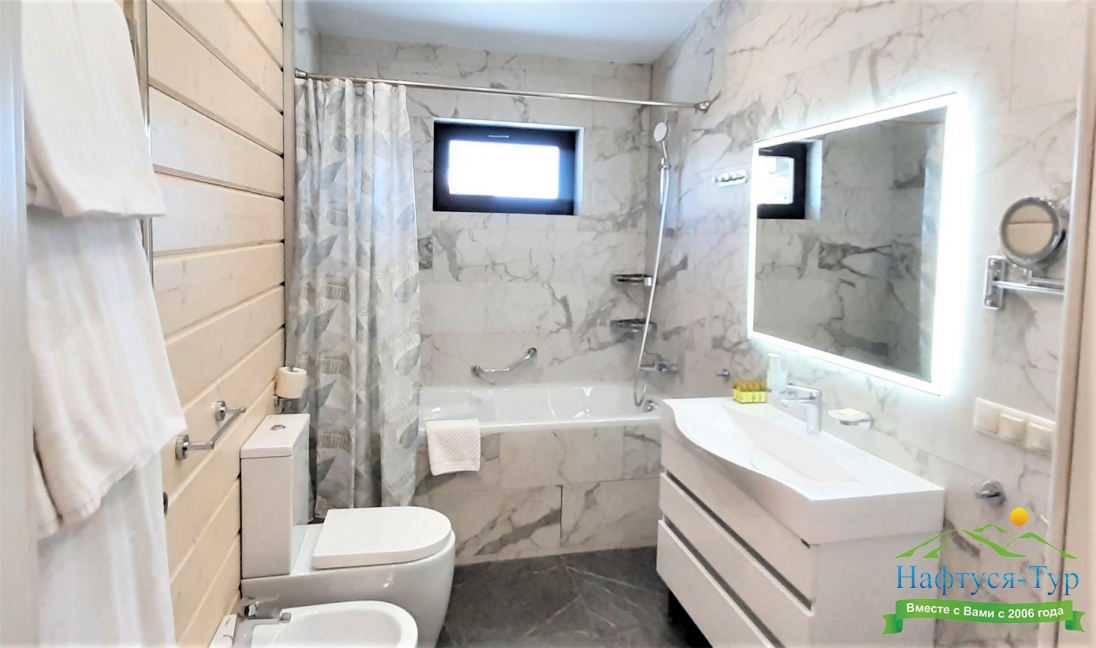 2 санузла, с ванной и душевой кабиной, тапочки, туалетные принадлежности, фен, халат