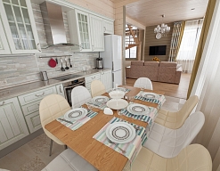 кухня, диван, зеркало, кровати односпальные /одна двуспальная кровать, прикроватные тумбочки, стол, стулья, тумба, шкаф