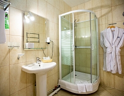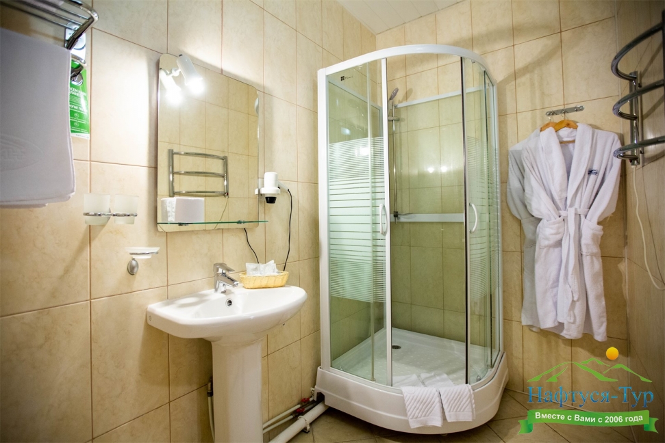 с душевой кабиной, туалетные принадлежности, фен