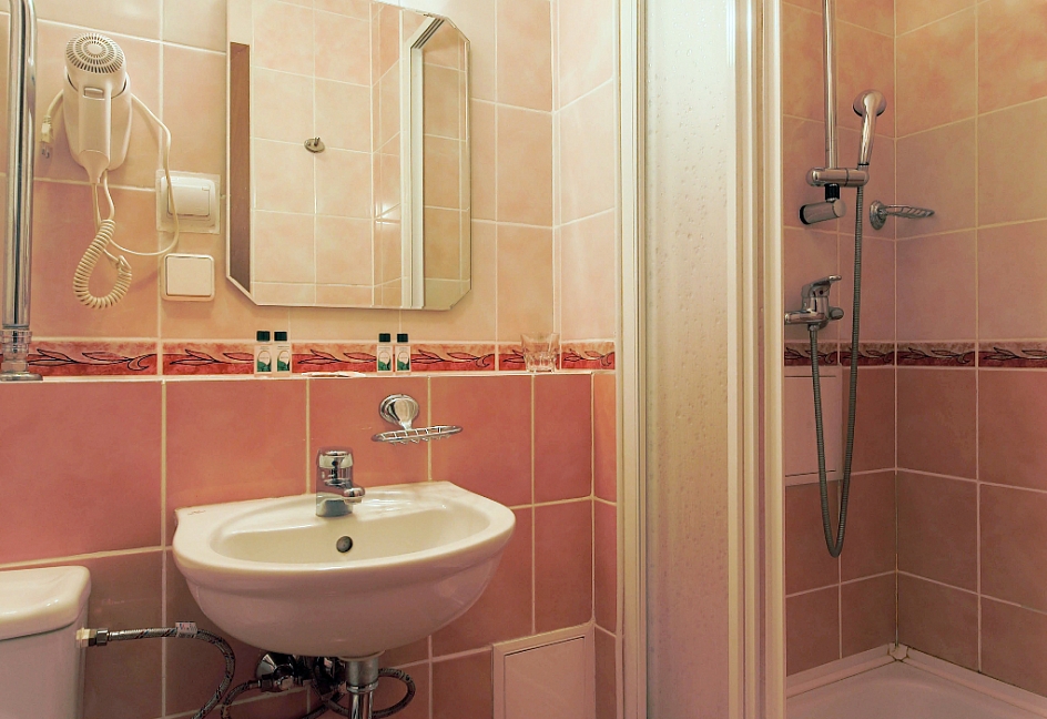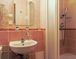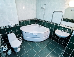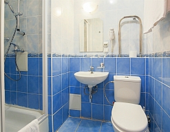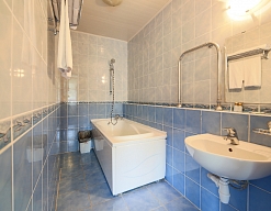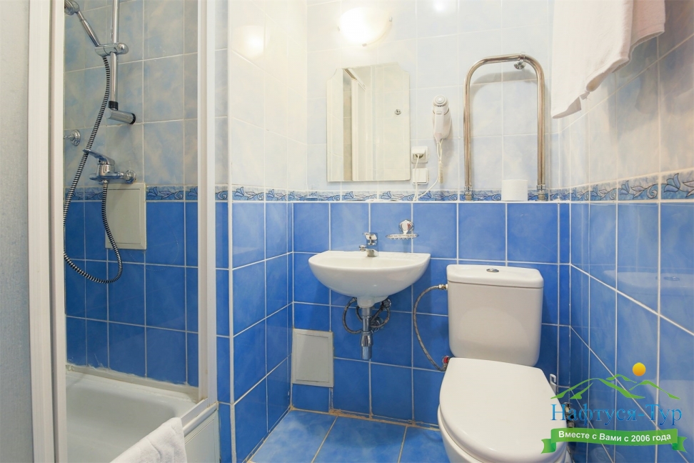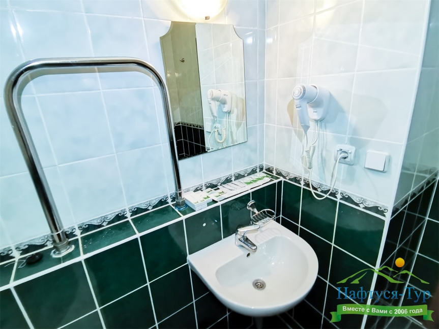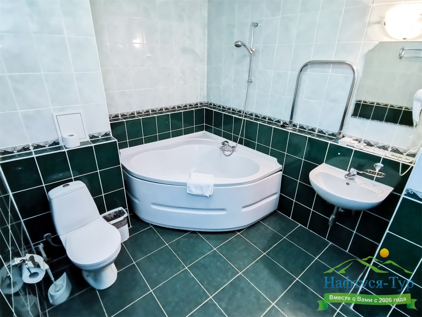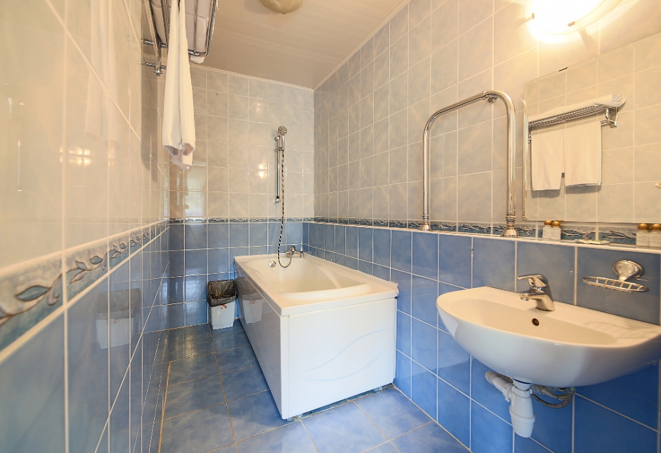 с ванной, с душем, тапочки, туалетные принадлежности, фен, халат