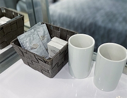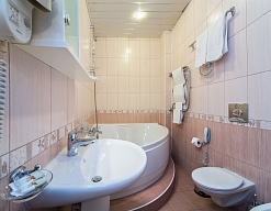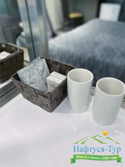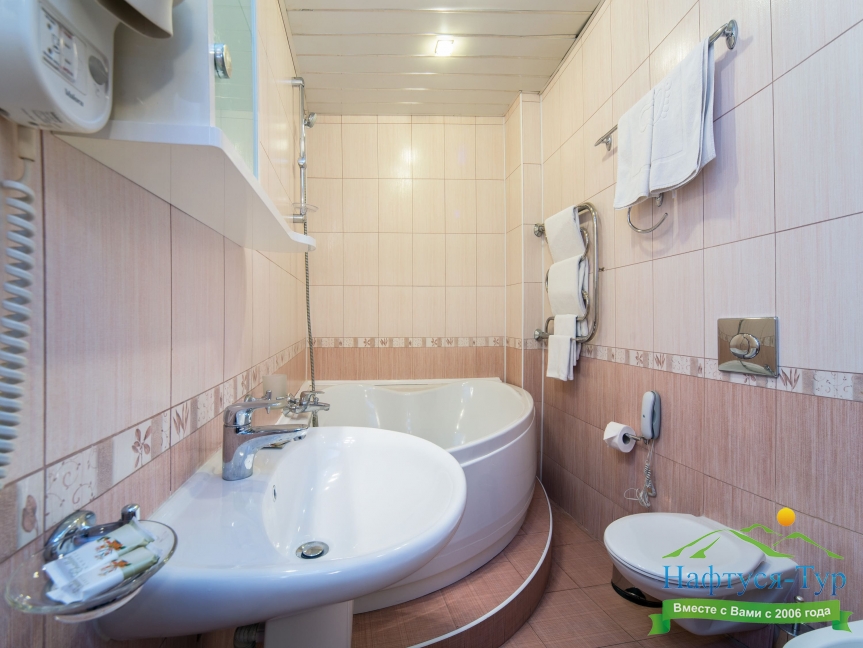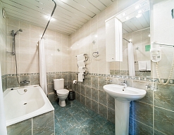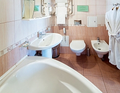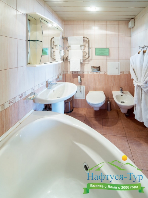 с ванной, тапочки, туалетные принадлежности, фен, халат