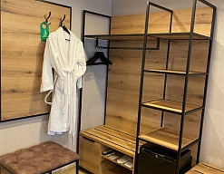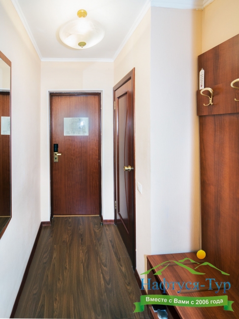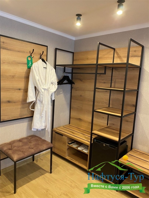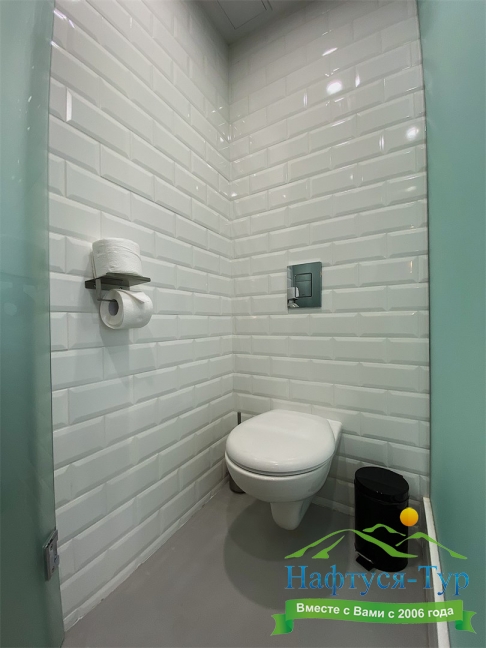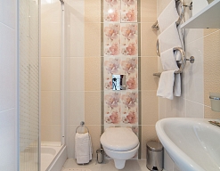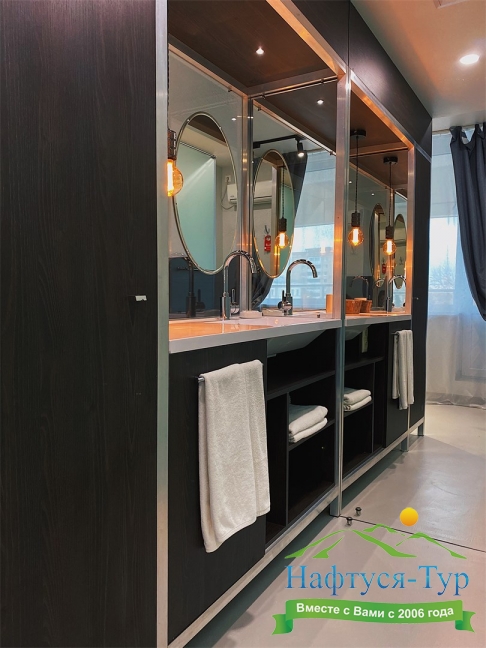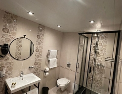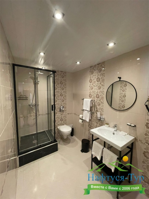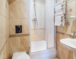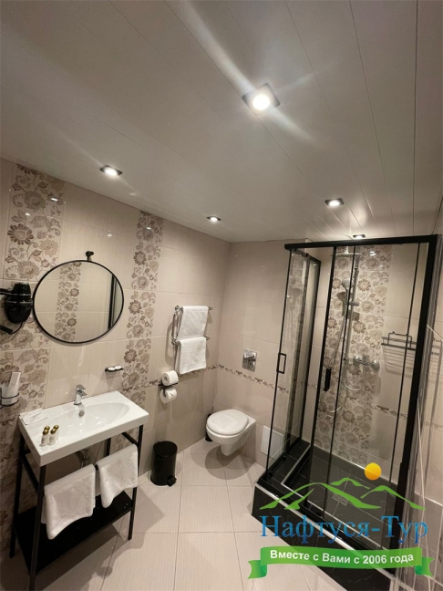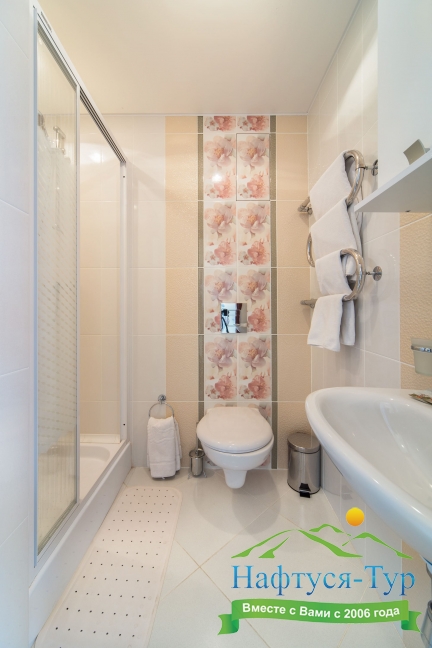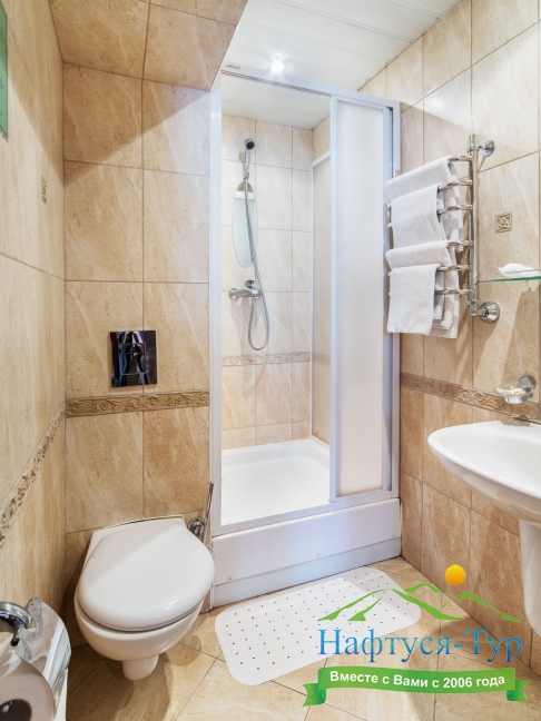 с душевой кабиной, тапочки, туалетные принадлежности, фен