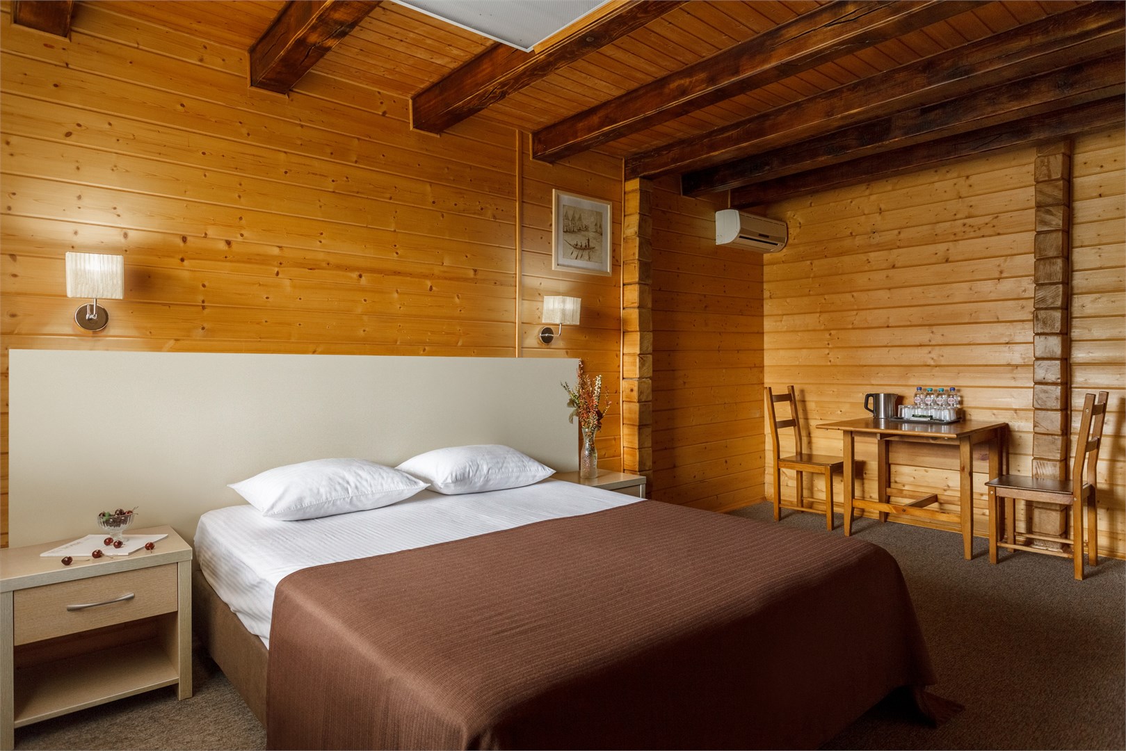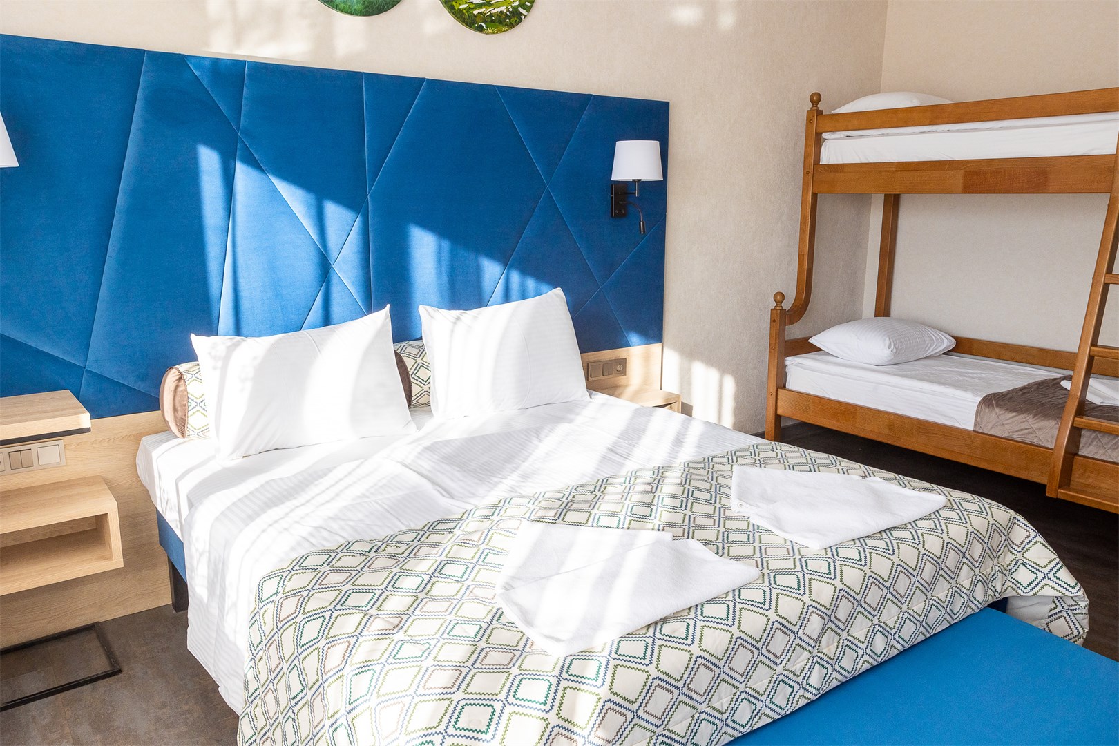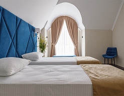 вешалка, кровати односпальные, кровать двуспальная, прикроватные тумбочки, стол, стулья, шкаф