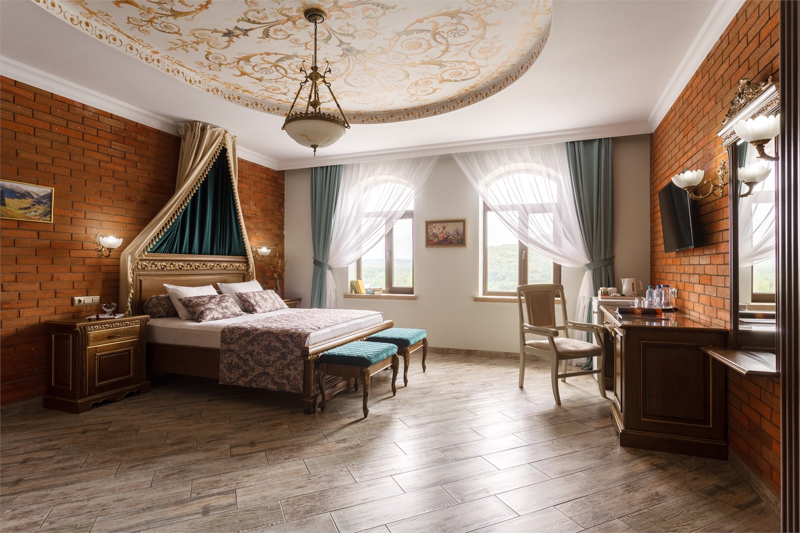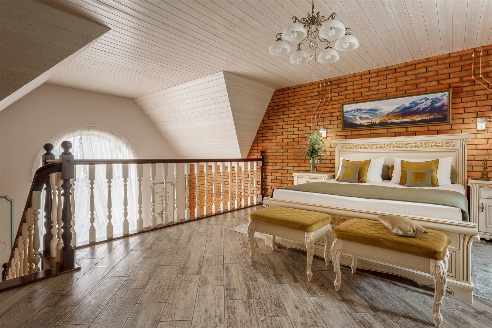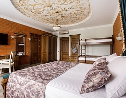 вешалка, зеркало, кровать двуспальная, кровать двухъярусная, прикроватные тумбочки, стол, стулья, шкаф