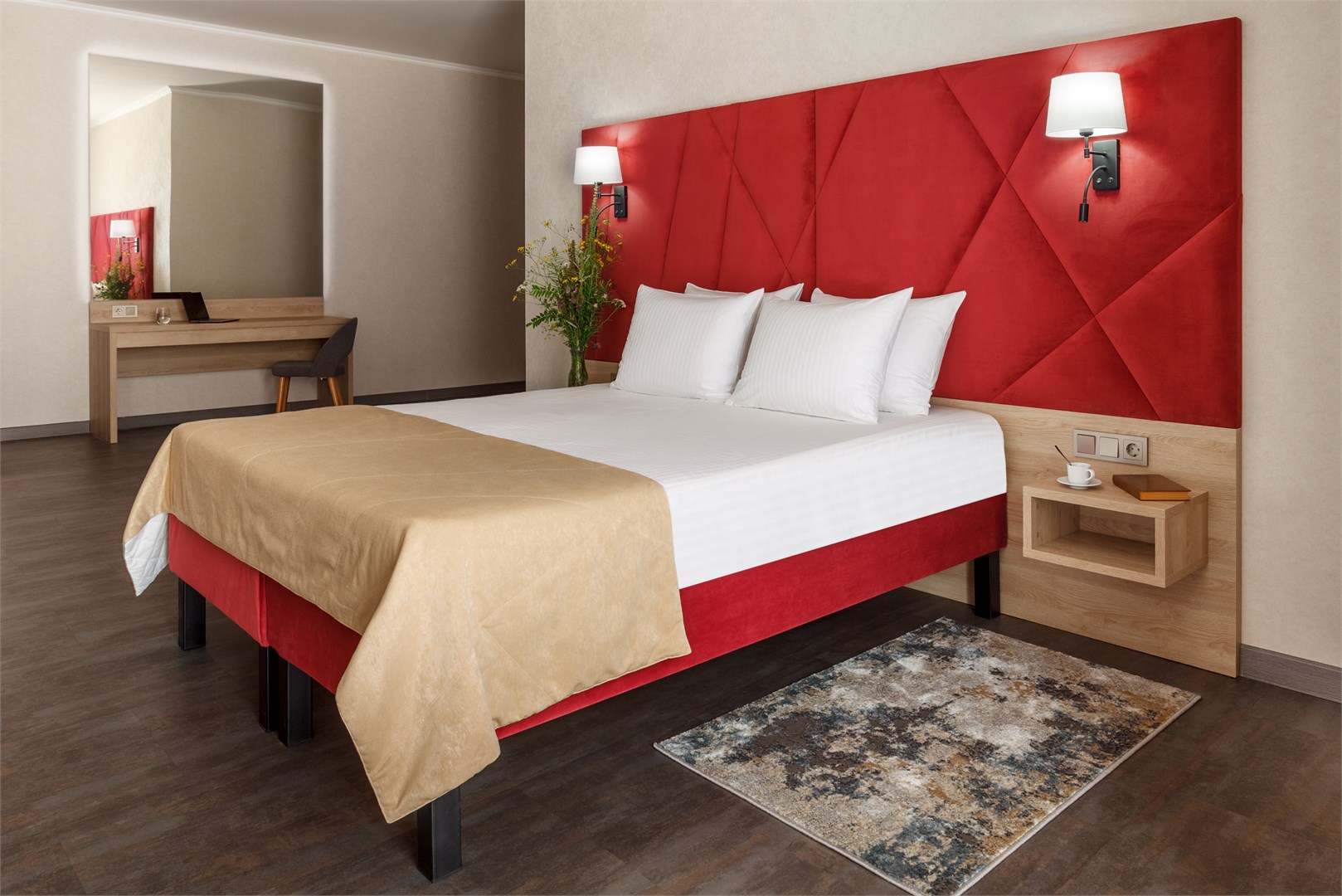 вешалка, зеркало, кровать двуспальная, прикроватные тумбочки, стол, стул, шкаф