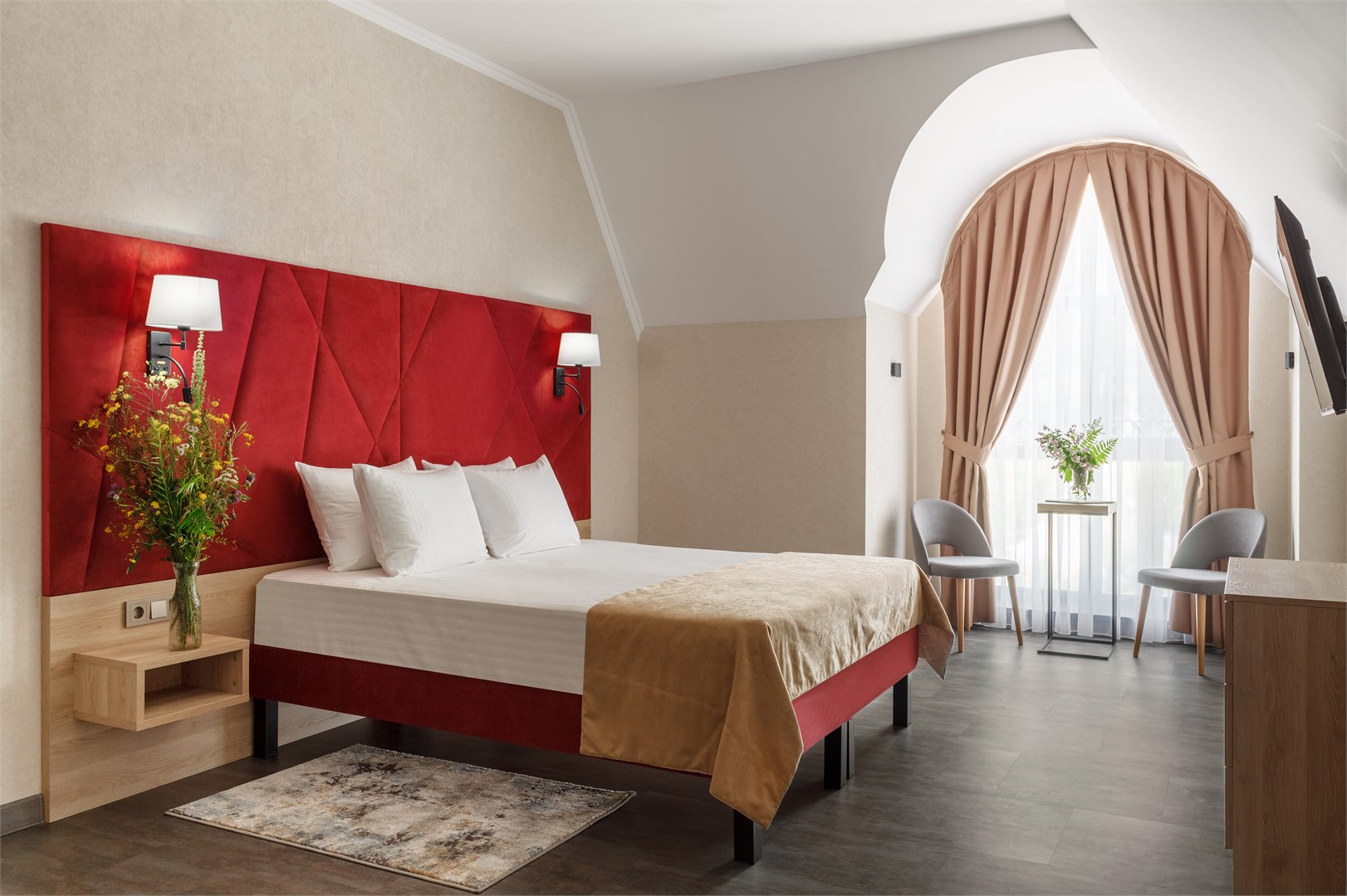 вешалка, зеркало, кровать двуспальная, прикроватные тумбочки, стол, стулья, шкаф
